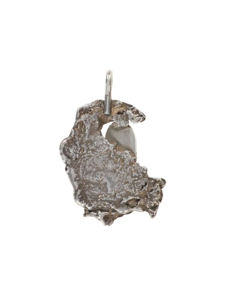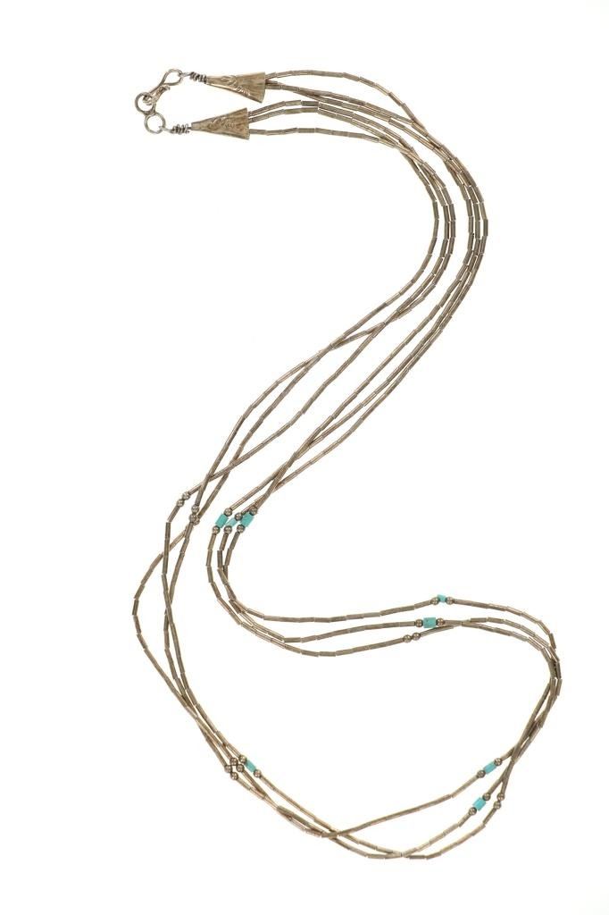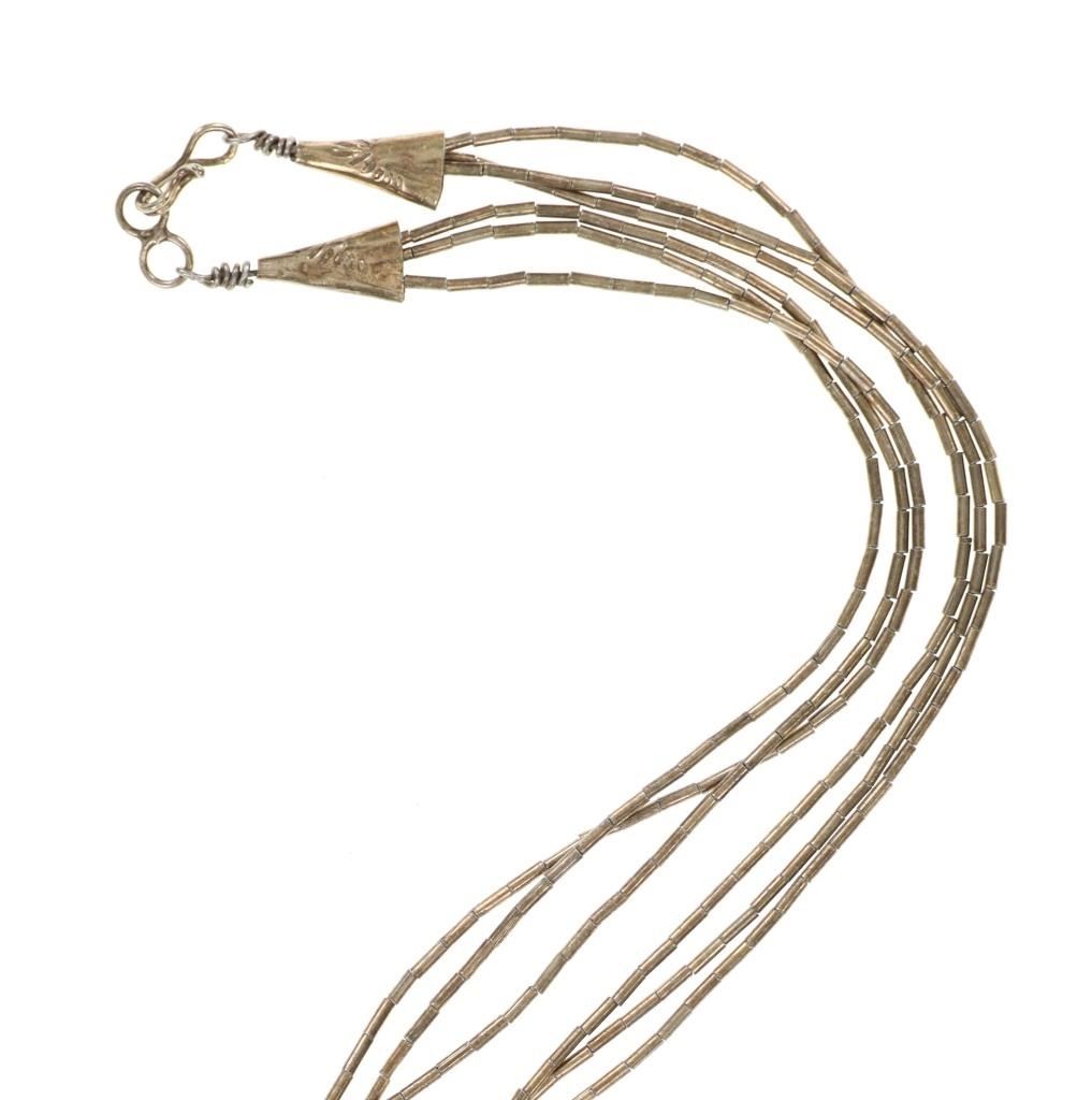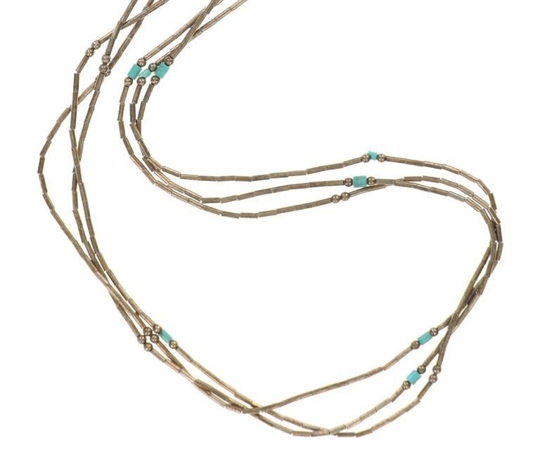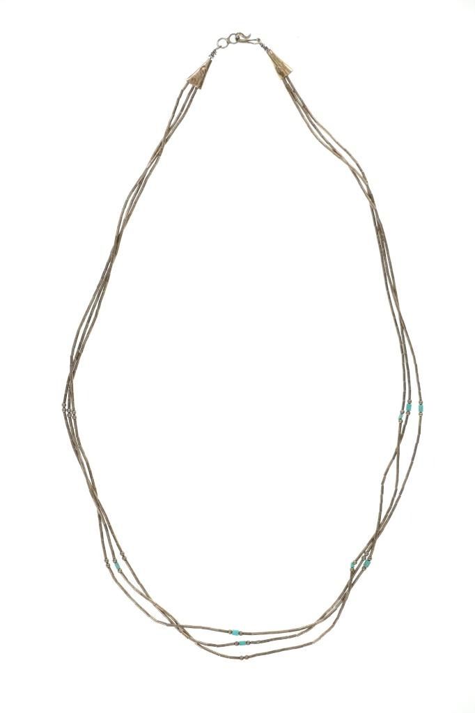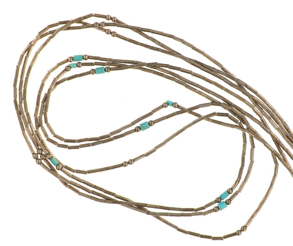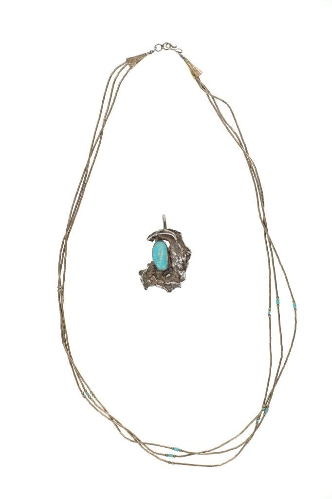 Featured in this lot is this Navajo silver and German silver necklace and pendant. The necklace features a multistrand design constructed from German silver and shows small turquoise beads. The pendant shows natural or molten shape to the silver with an oval cut Dry Creek Turquoise cabochon set into the center. The condition of this collection of Navajo jewelry is preserved with some slight patina and offset of coloration to the multi strand necklace and the pendant but otherwise is in preserved condition. The measurements of this necklace from clasp to clasp is 23 1/2" and the pendant measures 1 7/8" x 1 1/8". The collective weight of this collection is 26.6g.
