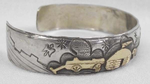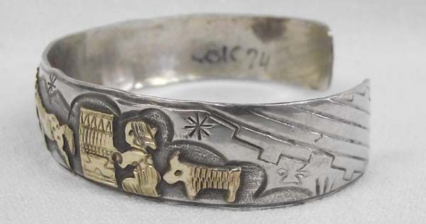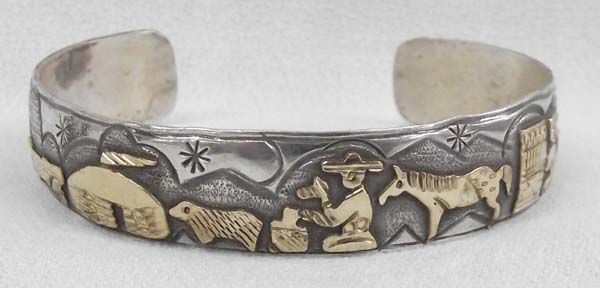 Native American Navajo Silver, Gold Storyteller Bracelet-Begay. Classic and beautiful storyteller bracelet is sterling with 12kgf overlay. Stamped on the back ''TA Begay, Sterling, 1/20 12kgf.'' Measures 7'' inside including opening and 1/2''W.