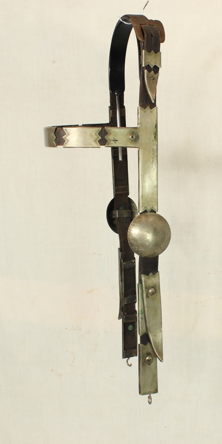 Striking early Native American silver mounted bridle with nice bucket, oversize domed conchos and silver tips. Very nicely made, with great eye appeal.