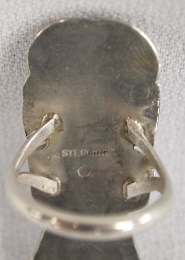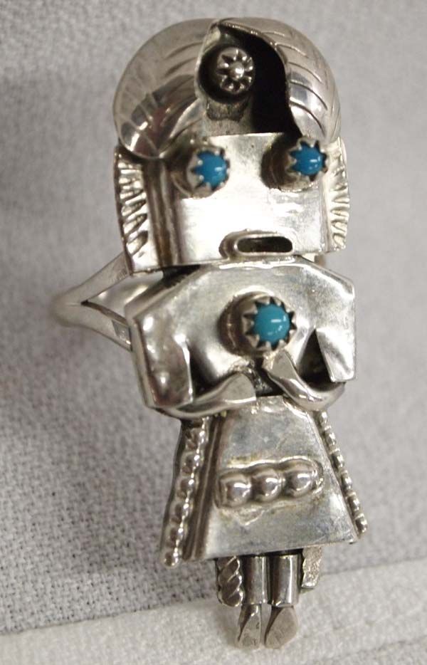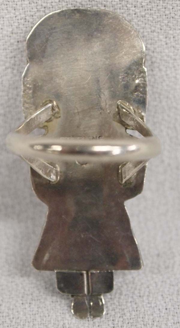 Navajo Sterling Silver Turquoise Kachina Ring by Orville Manygoats, Sz 8.5, stamped sterling and hallmarked O, measures 1.75''L x 1''W, 6.3g in total wt.