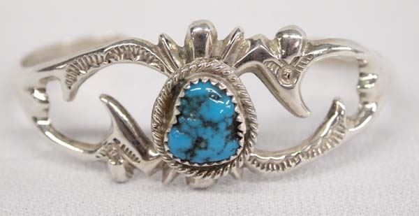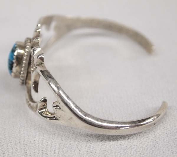 Native American Navajo Sterling Silver Kingman Turquoise Bracelet by F.L. Begay, inside measures 6.25'' which includes opening x 1''W, stamped sterling and hallmarked, 19.7g in total wt.