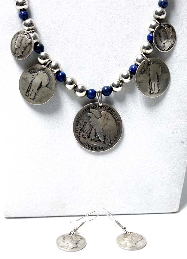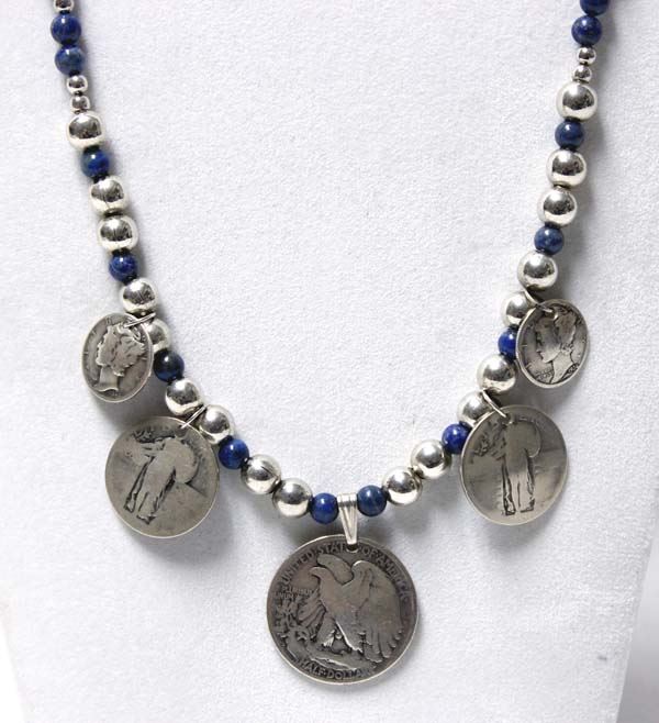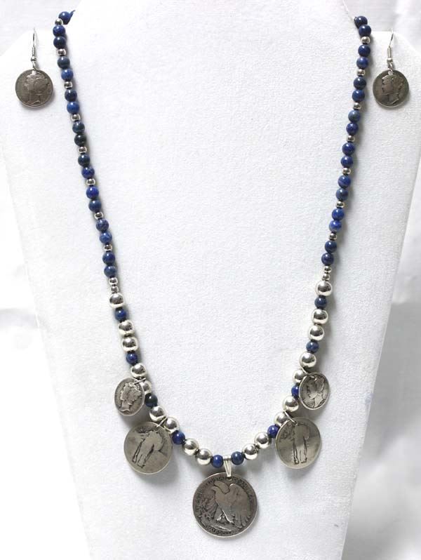 Native American Navajo Sterling Silver Lapis and Coin Necklace, sterling silver with Denim Lapis beads and vintage coins which includes Liberty Halves, old Quarters, and Mercury Dimes, measures 23'' end to end and comes with Mercury Dime Earrings measuring 1.5''L, 78.9g in total wt.