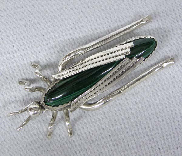 Navajo Silver Malachite Grasshopper Pin by Yazzie. 2x1". SHI $15