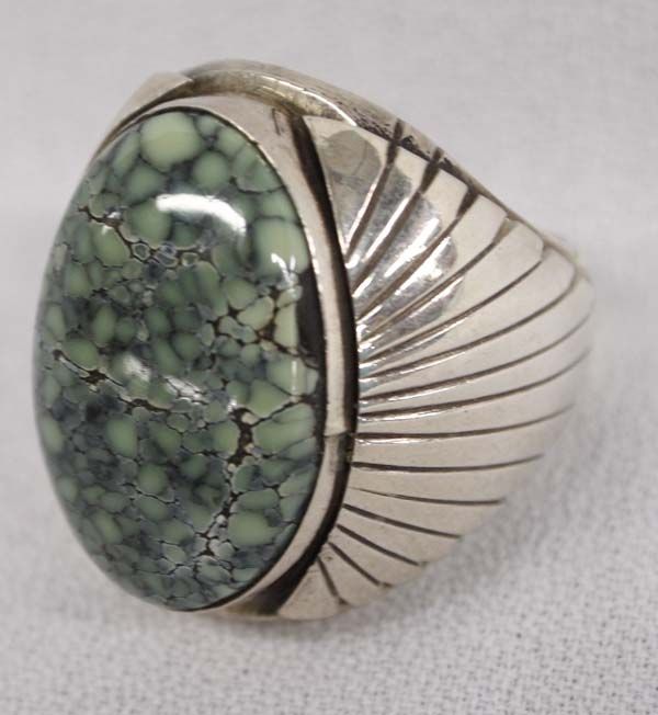 Navajo Silver Manassa Turquoise Ring by Augustine Largo, Size 12, measures 1'' W x 1''L, stamped sterling and hallmarked AL, 38.7g in total wt.