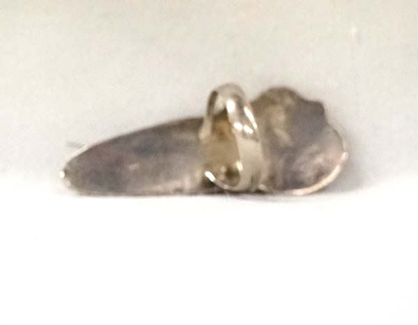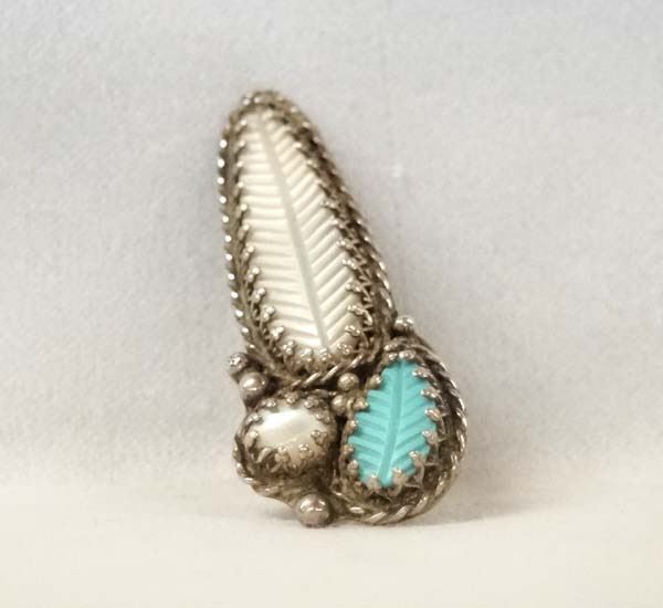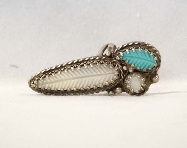 Native American Navajo Sterling Silver Carved Mother of Pearl & Turquoise Ring, Size 8, measures 2''L x .75''W