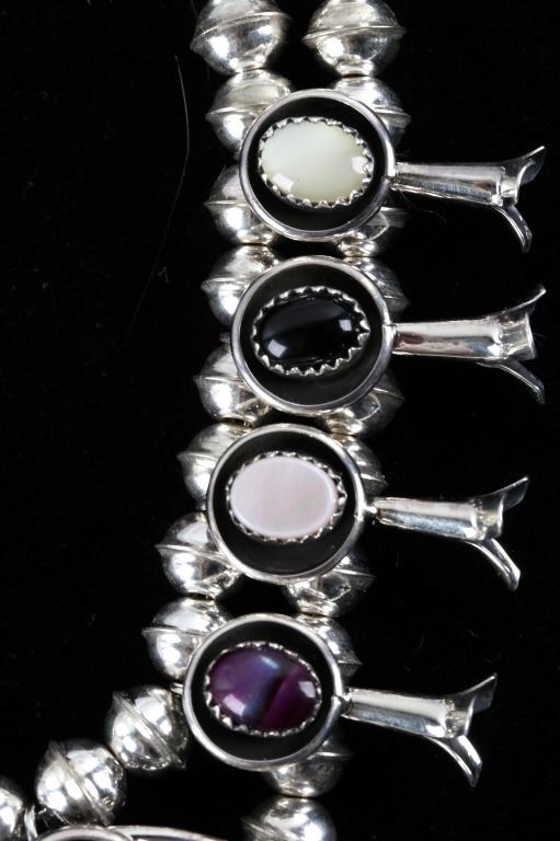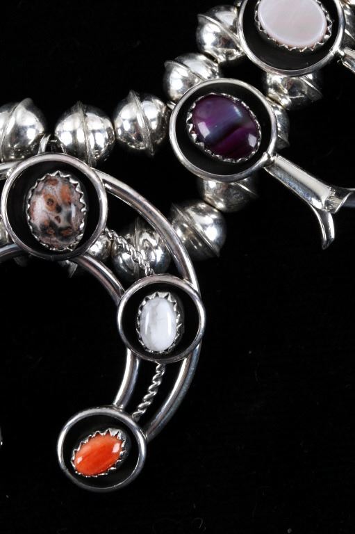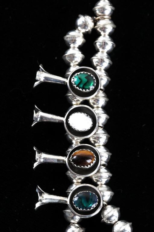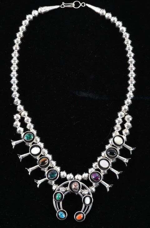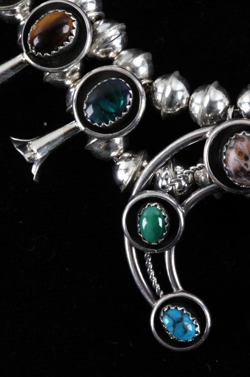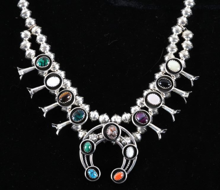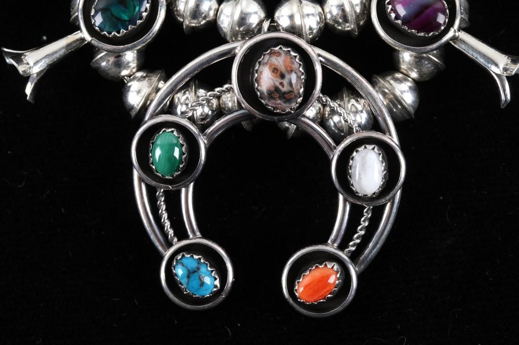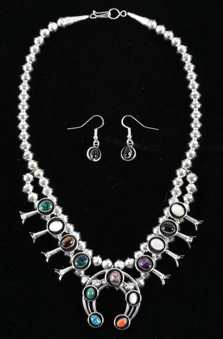 Featured in this lot is this Navajo sterling silver, multi-stone necklace and earrings made by renowned Navajo silversmith Phil Garcia. The necklace features a squash blossom design that shows blossoms with a multistone effort that shows stones such as mother of pearl, jet, pink conch gemstone, amethyst, agate, red branch coral, and turquoise cabochon set into their face and shows a open naga pendant as its central arrangement. There is a pair of earring in this collection that shows a dangle design that shows two oval cut jet cabochon set into the face of the earrings. The back of the necklace on the pendant is stamped, "Sterling PG". The condition of this collection of jewelry is good with no obvious signs of damage and shows good overall condition. The measurements of this necklace from clasp to clasp is15" L and the central pendant measures 1 1/2" L x 1 3/8" W. The earrings measure 1 1/8" L x 3/8" W and weigh 2.2 grams. The necklace weighs 46.5 grams.