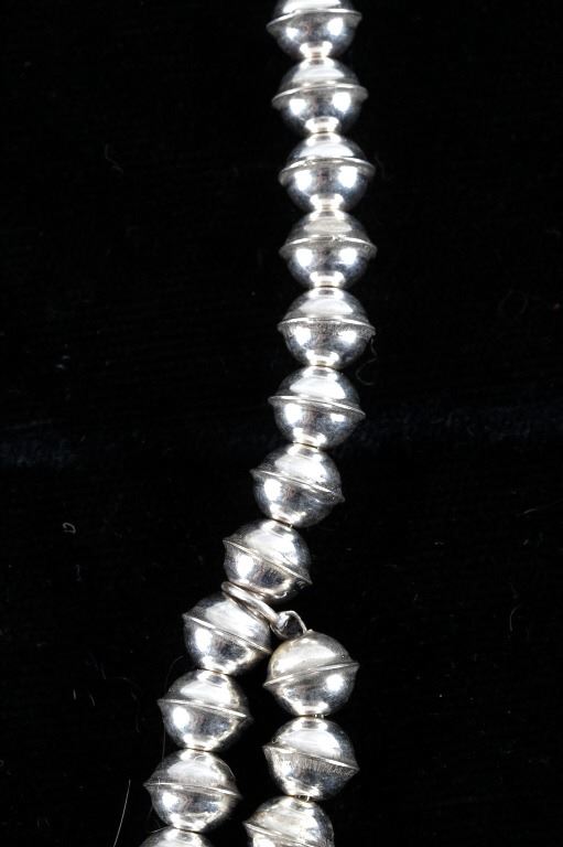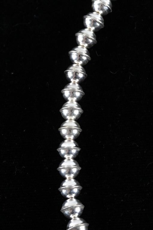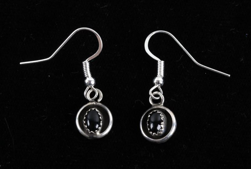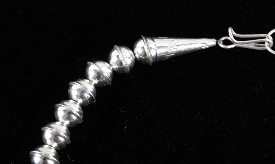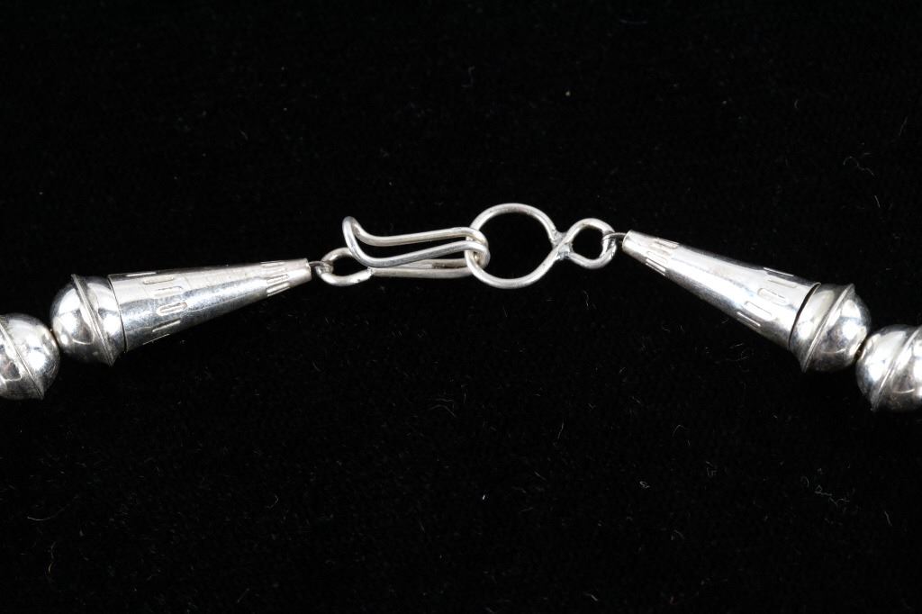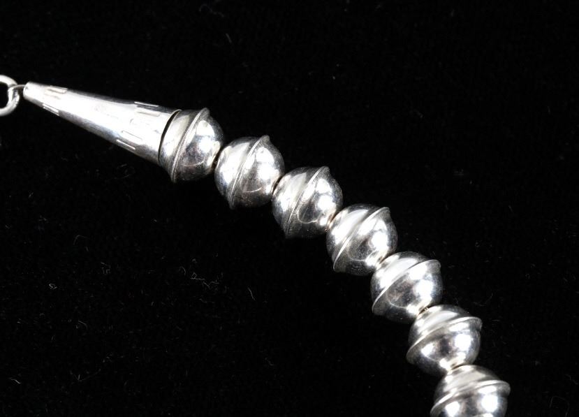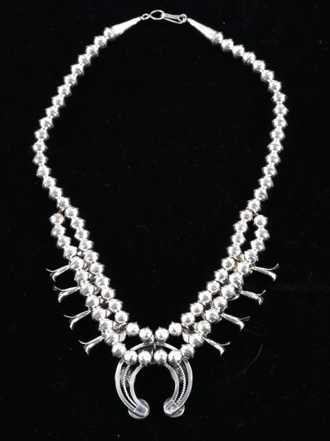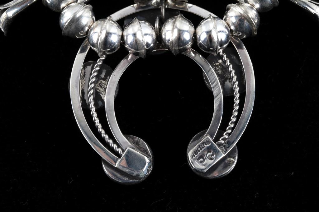 Featured in this lot is this Navajo sterling silver, multi-stone necklace and earrings made by renowned Navajo silversmith Phil Garcia. The necklace features a squash blossom design that shows blossoms with a multistone effort that shows stones such as mother of pearl, jet, pink conch gemstone, amethyst, agate, red branch coral, and turquoise cabochon set into their face and shows a open naga pendant as its central arrangement. There is a pair of earring in this collection that shows a dangle design that shows two oval cut jet cabochon set into the face of the earrings. The back of the necklace on the pendant is stamped, "Sterling PG". The condition of this collection of jewelry is good with no obvious signs of damage and shows good overall condition. The measurements of this necklace from clasp to clasp is15" L and the central pendant measures 1 1/2" L x 1 3/8" W. The earrings measure 1 1/8" L x 3/8" W and weigh 2.2 grams. The necklace weighs 46.5 grams.