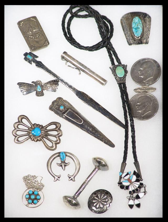 Circa 1930-1970, Collection of 14 vintage hand wrought silver and turquoise items including a money clip, bolo, pins, conchos, a rattle, etc.