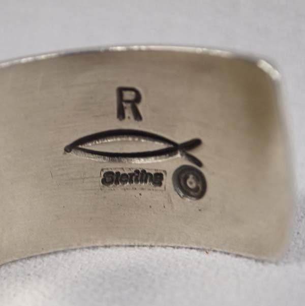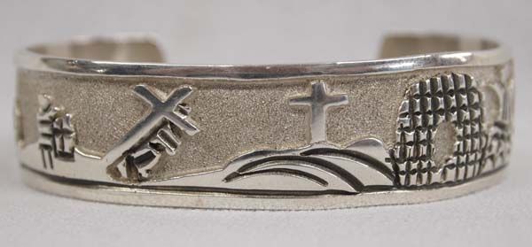 Navajo Silver Storyteller Bracelet by Roger John, inside measures 6.5'' which includes opening x .75''W, stamped sterling and hallmarked, 41.2g in total wt,