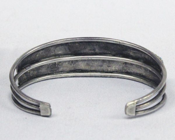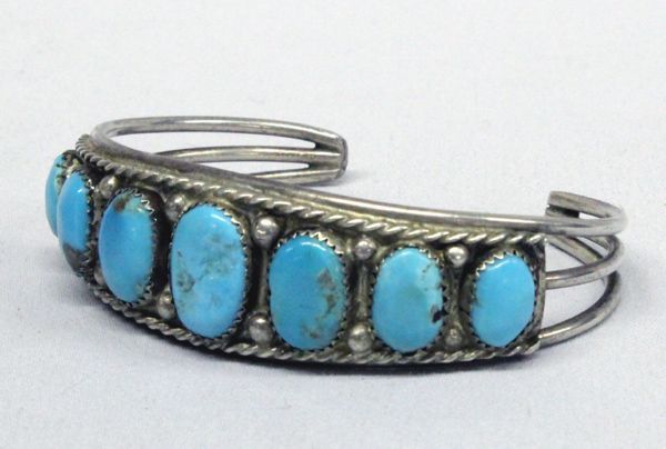 Native American Navajo Silver & Turquoise 3 Band Bracelet. Seven graduated turquoise cabochons are set on this 3 band silver bracelet with twisted rope and silver bead accents. It measures 7'' including the opening and is 7/8'' in width.