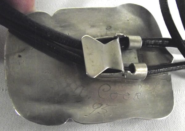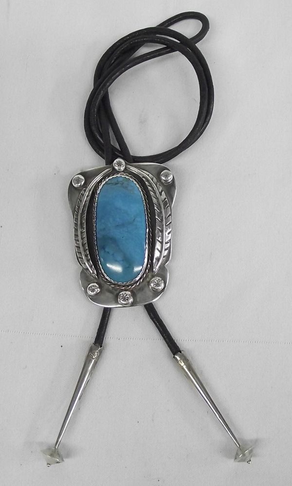 Navajo Silver Turquoise Bolo Tie - R A Cook. Really eye-catching sterling silver and turquoise slide on this bolo tie. The turquoise is a large stabilized oval (2''long) and is set in sterling silver with feathers on either side. It is signed on the back, ''R A Cook 95'' and is stamped ''Sterling.'' The slide overall measures 2-7/8''H x 2''W. Sterling tips on the ends. Single strand leather tie is 36'' long.