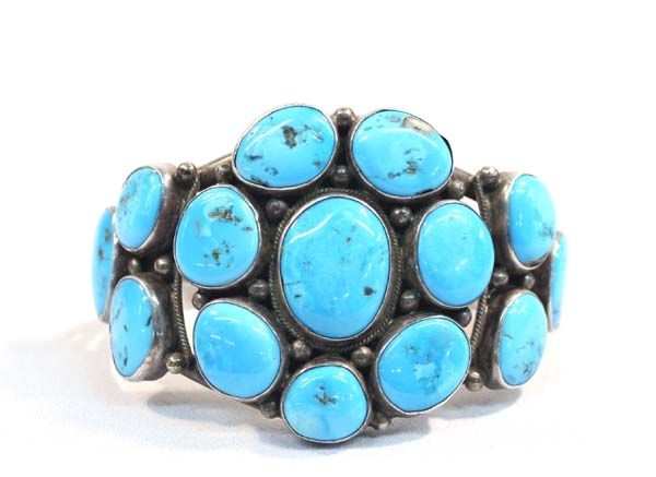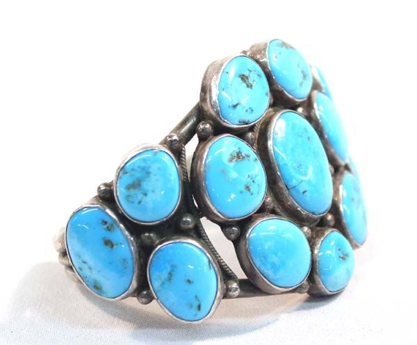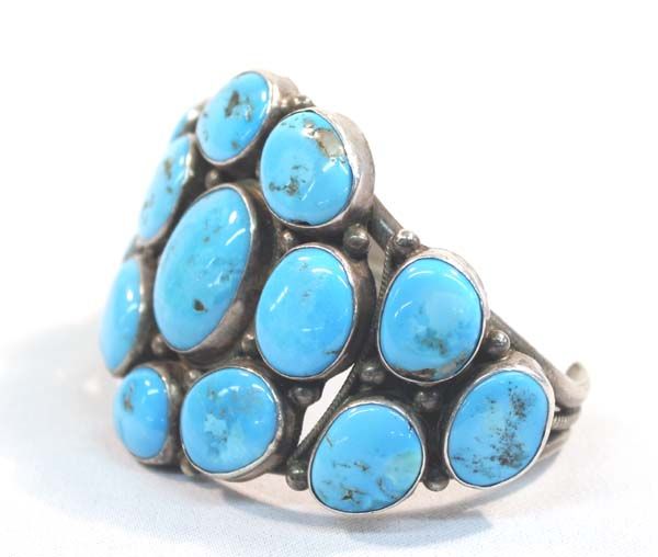 Native American Navajo Silver Turquoise Cluster Bracelet-Roie Jacque. Fourteen natural turquoise stones. Wrist measurement is 6 5/8'' x 2''H. The center stone is 7/8''H x .75''W. A braided cord of sterling runs in the middle of the cuff along the inside on the back. Not meant to be bent so measure your wrist carefully.