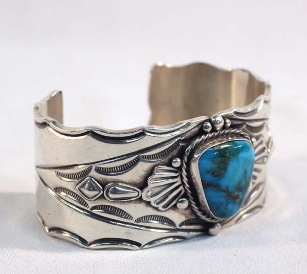 Navajo Silver Turquoise Bracelet-Tsosie. This heavy ''sterling'' stamped band measures 7'' x 1 3/8''H. and will not be easy to bend, correct wrist size suggested. The green and blue turquoise stone with copper color matrix measures 7/8''H x 7/8'' at widest part. Hallmarked.