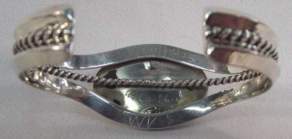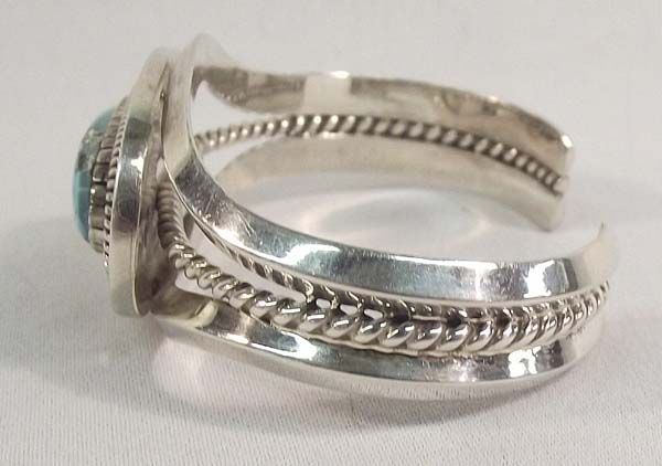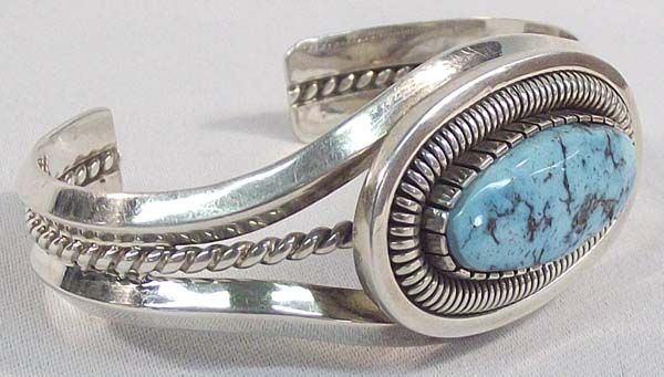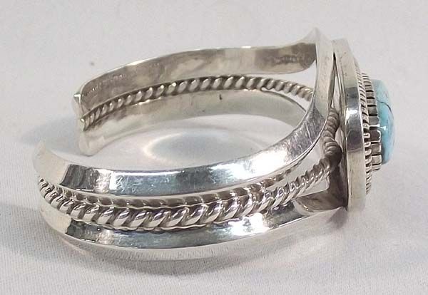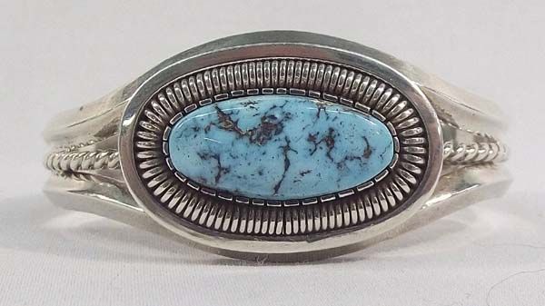 Native American Navajo Silver Turquoise Bracelet-Walter Vandever Wrist including opening is 6'' x 1 1/8''H. Gorgeous sky blue color with nice matrix throughout. Stone measures .5'' x 1''. Christmas is coming!