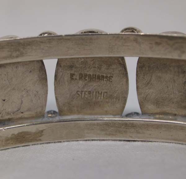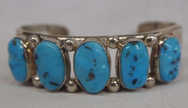 Navajo Sterling Silver & Kingman Turquoise Bracelet by E Redhorse. This beautiful piece of jewelry is Hallmarked ''E. Redhorse Sterling'' and has 5 turquoise cabochons measuring approx. .75''L x .5''W. and has an inside measurement of 6.5'' and is .75'' wide, 41.99g in total wt.