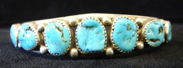 Navajo Silver Turquoise Bracelet by Yazzie Johnson. Has 7 natural Castledome turquoise cabochons. Has Hallmark ''Y'' stamped on back for Yazzie Johnson and stamped sterling. Measures 6.5'' inside including opening and 5/8'' at widest. SHI $15.