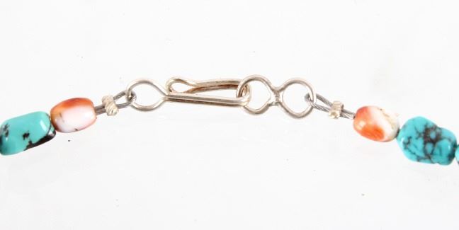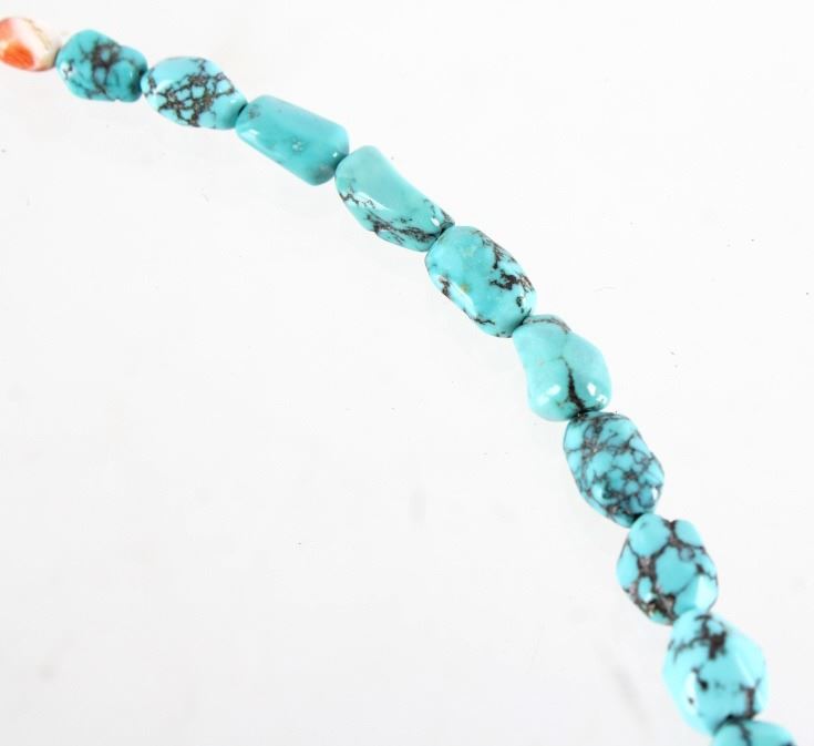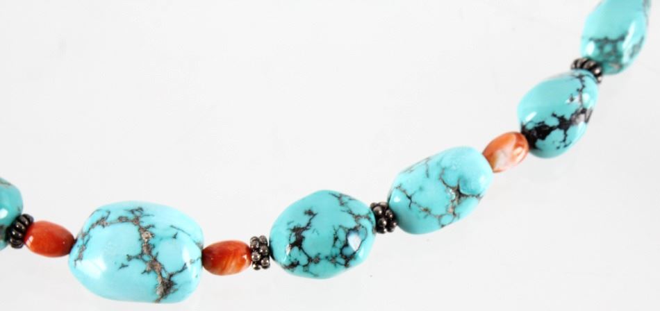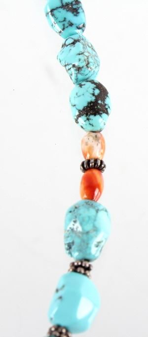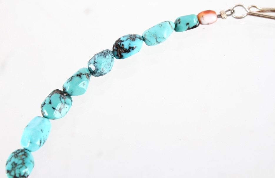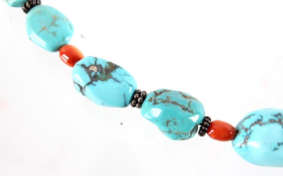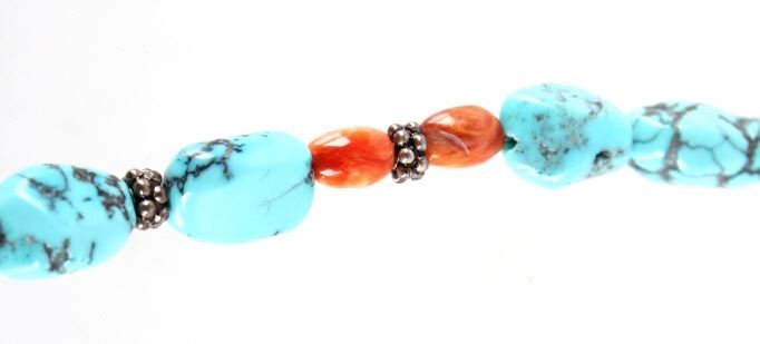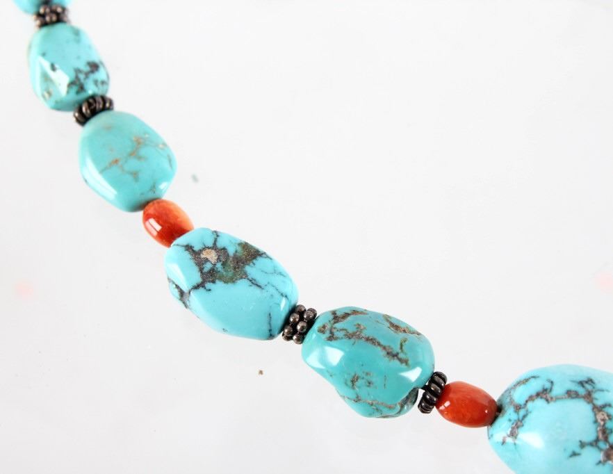 For your consideration is this Navajo silver sleeping beauty turquoise and orange carnelian necklace. The necklace shows 37 sleeping beauty polished turquoise stones with ten finely polished oval stones with twelve tiny silver flower spacer beads throughout. The clasp on this necklace is crafted from silver. The condition of this necklace is great with wonderful examples of turquoise and no obvious signs of damage. The measurements of this necklace are 19 3/4" from clasp to clasp and the measurements from clasp to bottom of the necklace are 9". The collective weight of this necklace is 35.4g.