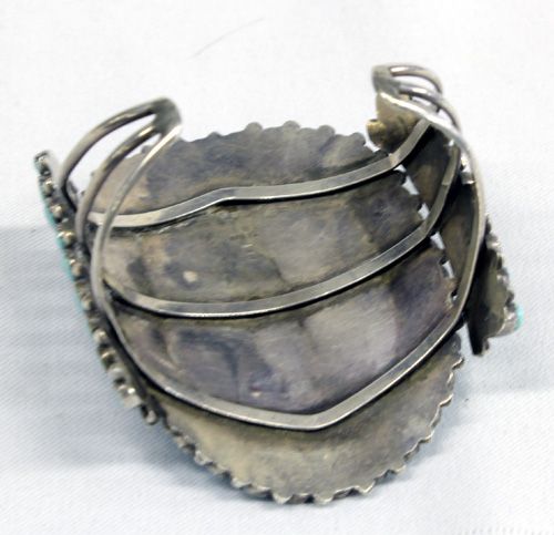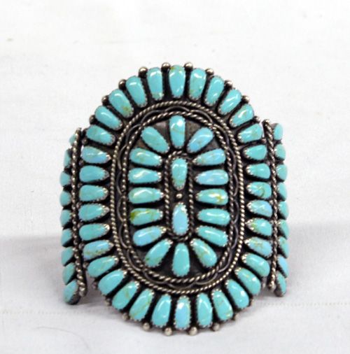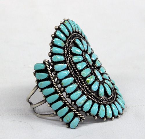 Navajo Silver Turquoise Cluster Bracelet - Mae Bia. Tremendous old pawn vintage Navajo traditional cluster bracelet. Wonderful collection of blue green turquoise cabochons. They are shaped into wide teardrops. Ornate hand crafted silver lassos and impeccable silver raindrops border the cabochons. The bracelet is 3'' at its widest and it measures 6.5'' inside including the opening. Stamped on the inside ''B Sterling'' for artist Mae Bia.