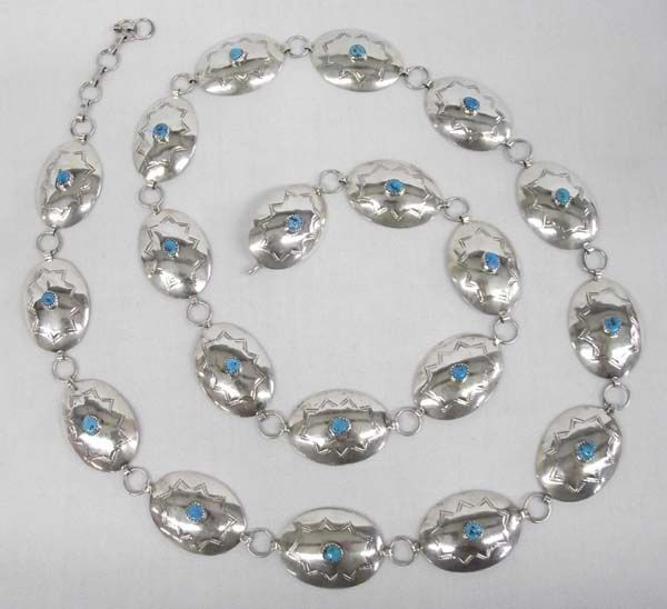 Navajo Silver Turquoise Concho Belt - KS. Shinning sterling silver conchos with a blue turquoise nugget in the center of each one. The artist's hallmark, ''KS'' and ''Sterling'' are stamped on both end conchos. The belt measures 45.25''Lx1''W.
