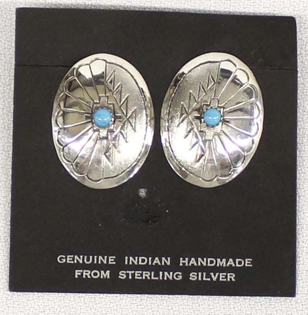Native American Navajo Sterling Silver Turquoise Concho Clip-On Earrings, measure 1.25'' x 7/8'', stamped sterling