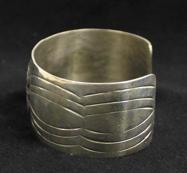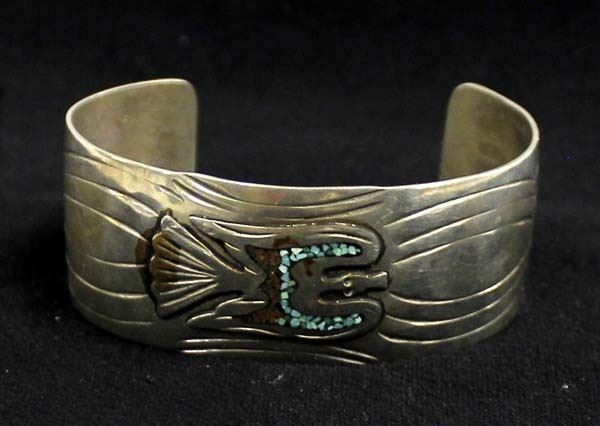 Vintage Native American Navajo Sterling Silver Turquoise and Coral Chip Inlay Bracelet, Peyote Bird motif, inside measures 7'' which includes the opening x 1''W