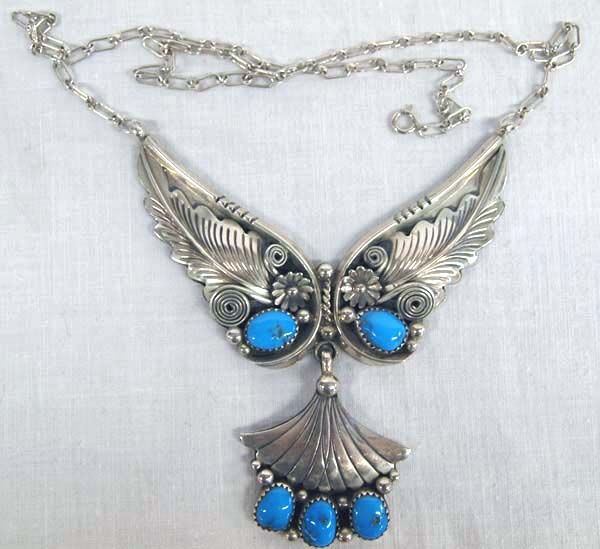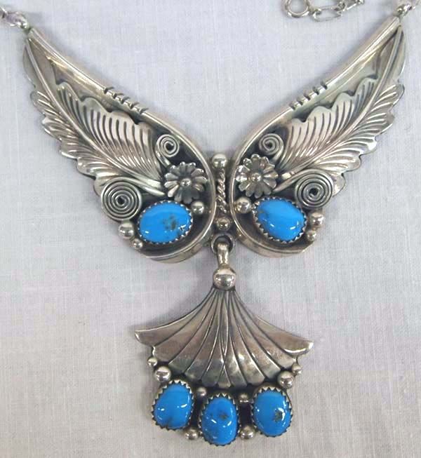 Phenomenal Navajo Sterling Silver Turquoise Necklace by Henry Addikie, hand wrought chain measures 18.25'' end to end, pendant section measures 3''L x 3''W and features 5 Bisbee Blue Sawtooth Bezel Set Turquoise cabochons, very traditional Navajo style setting of flower and leaf motif, scrollwork, and silver bead accents, carved edges, 34.5g in total wt. Truly an amazing work of art!
