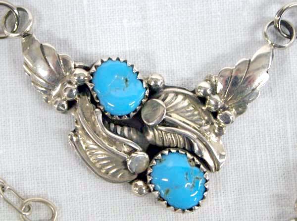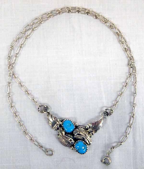 Lovely Navajo Sterling Silver Bisbee Blue Turquoise Necklace by Vernon Begay, hallmarked VB and stamped .925, measures 19.5'' end to end, pendant area measures 1.5''W x 1''L, features 2 Bisbee Blue cabochons measuring 5/16''W, 9.7g in total wt.