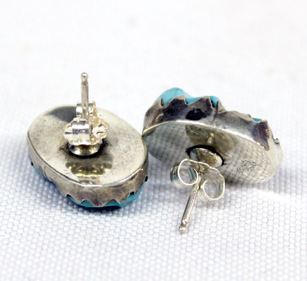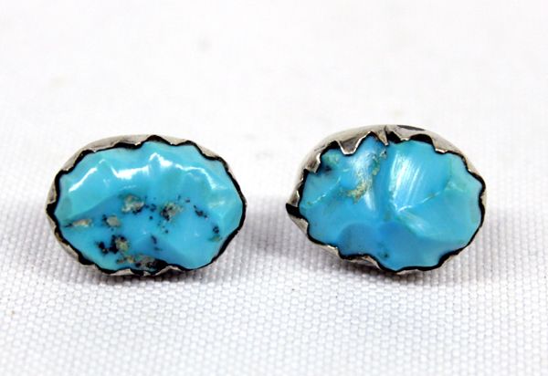 Navajo Silver & Turquoise Nugget Earrings. Sawtooth prong set turquoise nuggets, silver backs with post-style fittings. They measure 5/8'' long and 1/2'' wide.