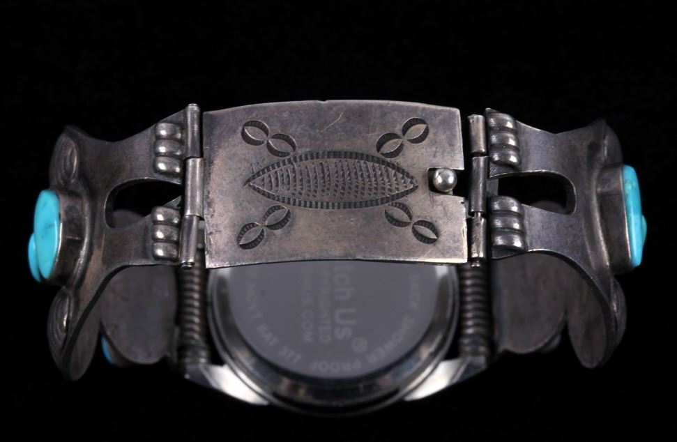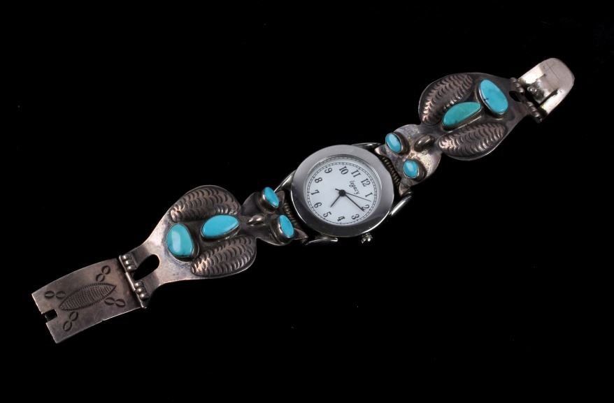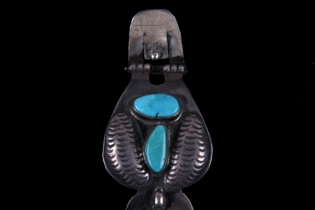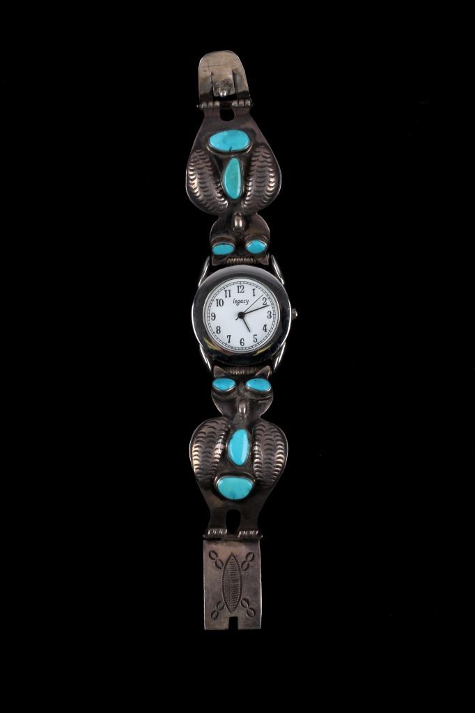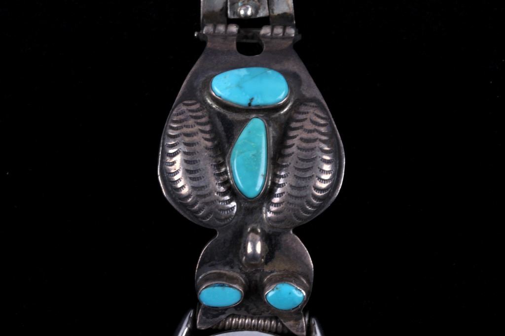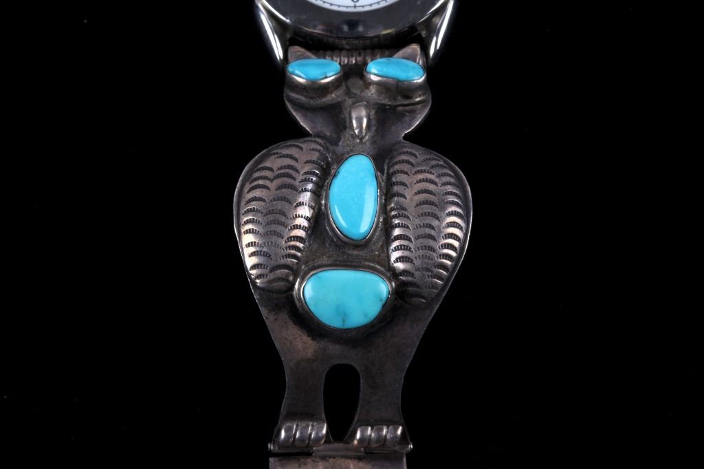 For your consideration is this Navajo silver and sleeping beauty turquoise owl effigy watchband. The watch band shows good craftsmanship with wonderful examples of owl effigies, silver construction, and eight sleeping beauty turquoise stones throughout. The condition of this watchband is good, with no obvious signs of damage and a slight patina to the silver. The measurements of his watch band are 6 3/4" x 1 1/4".