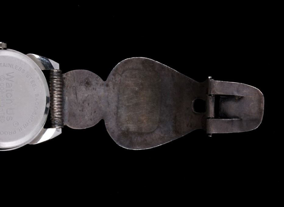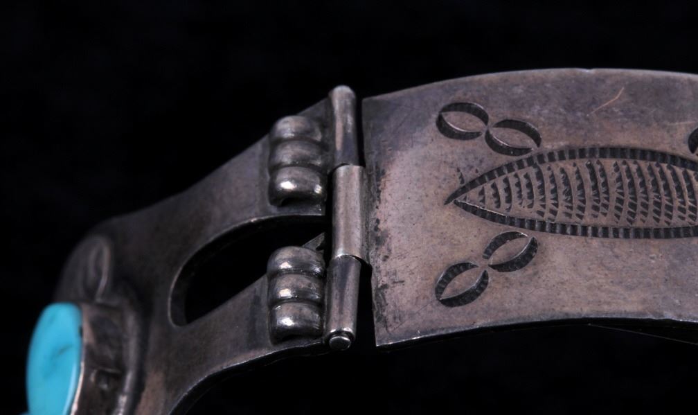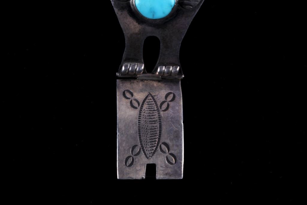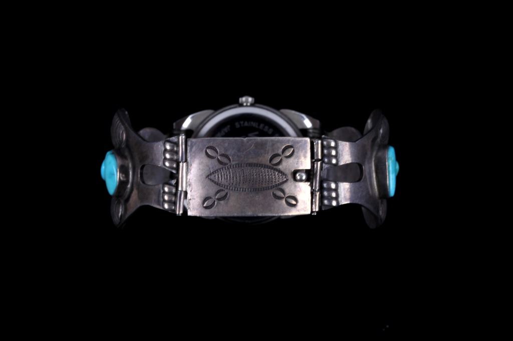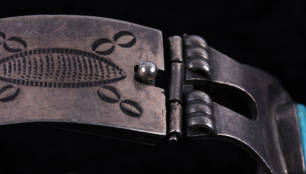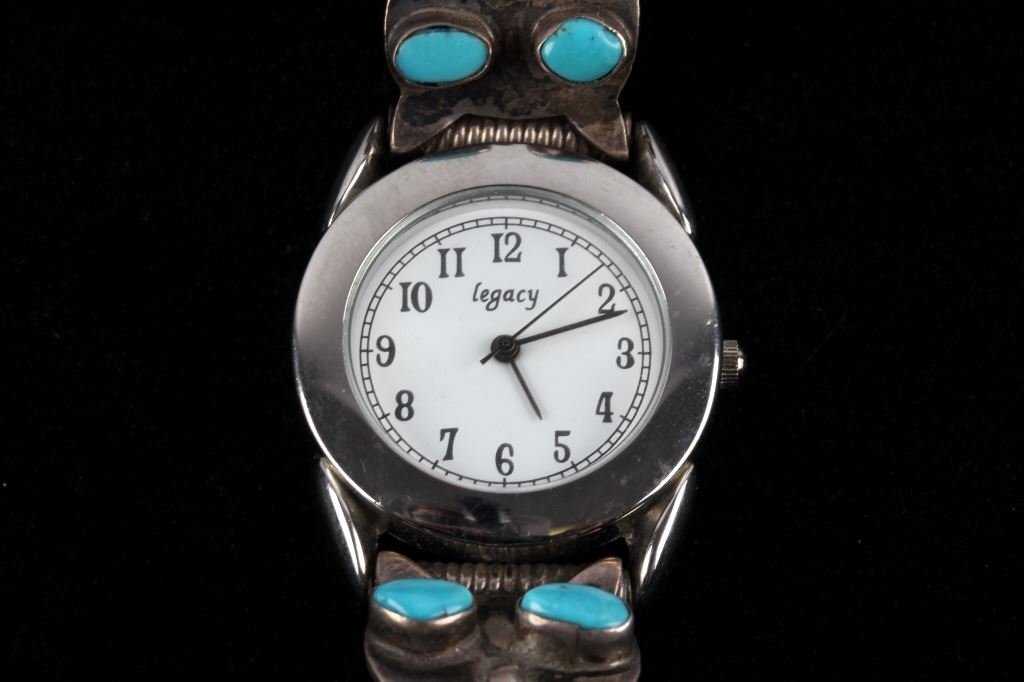 For your consideration is this Navajo silver and sleeping beauty turquoise owl effigy watchband. The watch band shows good craftsmanship with wonderful examples of owl effigies, silver construction, and eight sleeping beauty turquoise stones throughout. The condition of this watchband is good, with no obvious signs of damage and a slight patina to the silver. The measurements of his watch band are 6 3/4" x 1 1/4".