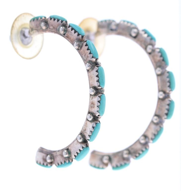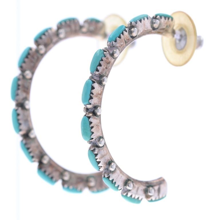 For your bidding pleasure in this lot is a beautiful pair of Navajo sterling silver and turquoise hoop earrings. This piece of Native American jewelry is Navajo hand crafted out of sterling silver and turquoise stones. A total of twenty stones (ten in each earring) are gently placed in hand cut bezel settings, while mini silver beads highlight for an amazing finish. Turquoise is the birthstone of December. It is believed that turquoise tends to bring good fortune, strength and helps overcome illness. Native Americans have prized turquoise since the time of the Aztecs, who mined it in New Mexico. The natural variations that occur in turquoise are part of its appeal and beauty. These earrings are for pierced ears. The hoops are a 3" half circle, with the petit point turquoise stones 1/4" long each. The total weight for these earrrings is 9.0grams These earrings are in good condition.