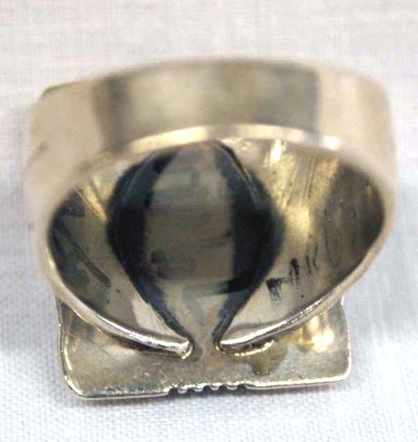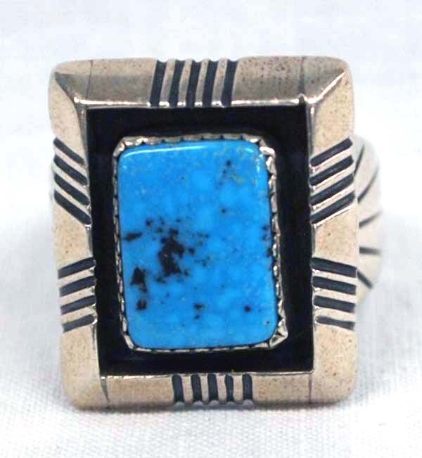 Navajo Silver Turquoise Ring, Size 11 William Denetdale, features a beautiful sawtooth bezel set Bisbee Blue cabochon measuring .5'' x 3/8'', ring measures 7/8''square, hallmarked W. Denetdale Navajo and stamped sterling, Artist Bio: A quiet man, Will Denetdale rises each morning to the sun and his work. It is a life he has chosen for himself. Every day he thinks about his art; every night he dreams about his work, the creation process stirring within him. Born at Fort Defiance, Arizona, Will attended high school in Gallup, New Mexico, where he took silversmithing classes. After graduating he stayed in Gallup for a while, working in the production of silver and turquoise jewelry, but his special talent craved personal expression. Will lives in Southern Arizona where he works in his home. 14g in total wt.