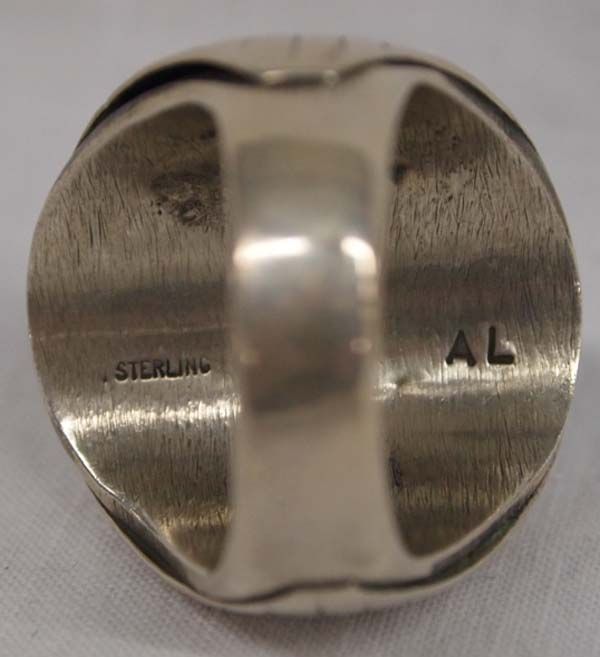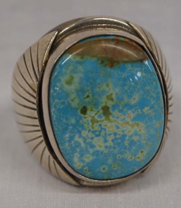 Navajo Sterling Turquoise Ring by Augustine Largo, Size 13, measures 1 1/8''L x 1''W, features a beautiful blue green turquoise cabochon measuring 1'' x 1'', carved silver sides, 37.6g in total wt.