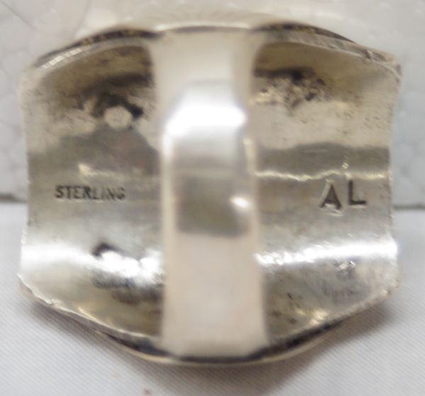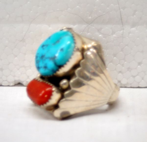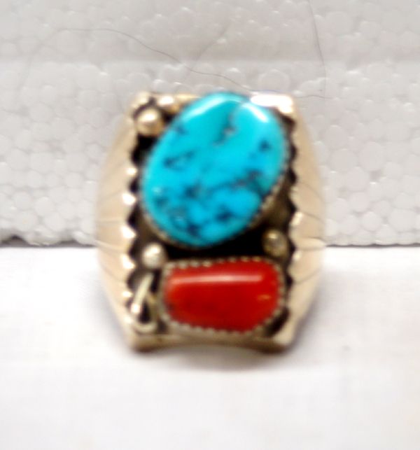 Navajo Sterling Kingman Turquoise Ring by Augustine Largo, size 11, hallmarked AL, very traditional style setting of scrollwork and silver bead accetns, measures 1'' x .75'', features a beautiful sawtooth bezel set Kingman Turquoise cabochon measuring 5/8'' x .75'' and blood red coral cab, 25.9g in total wt.