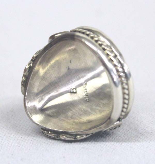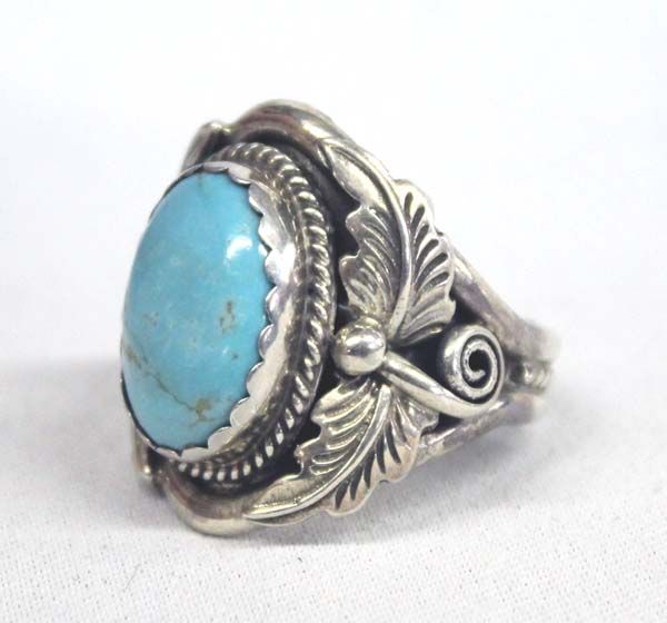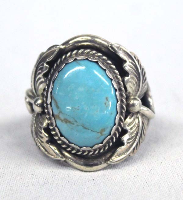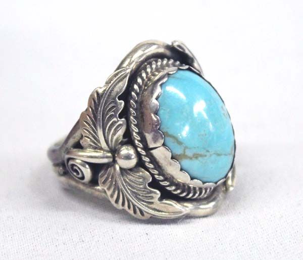 Navajo Sterling Silver Bisbee Blue Turquoise Ring by Billy Slim, size 10.75, hallmarked B, stone measures .75'' x .5'', stamped sterling, features leaf motif with silver bead accents, 14.32g in total wt.