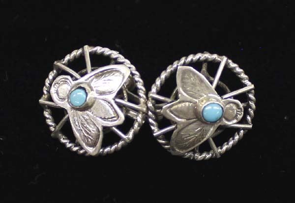 Vintage Native American Navajo Sterling Turquoise Screwback Bee Earrings, measures .75''D, hand stamped details on the wings, Sweet!