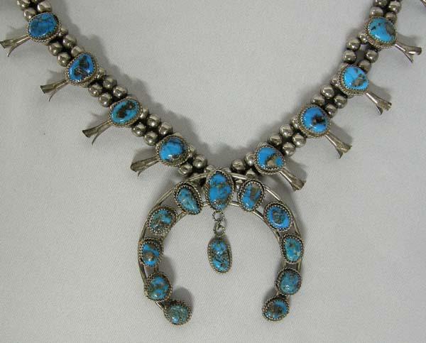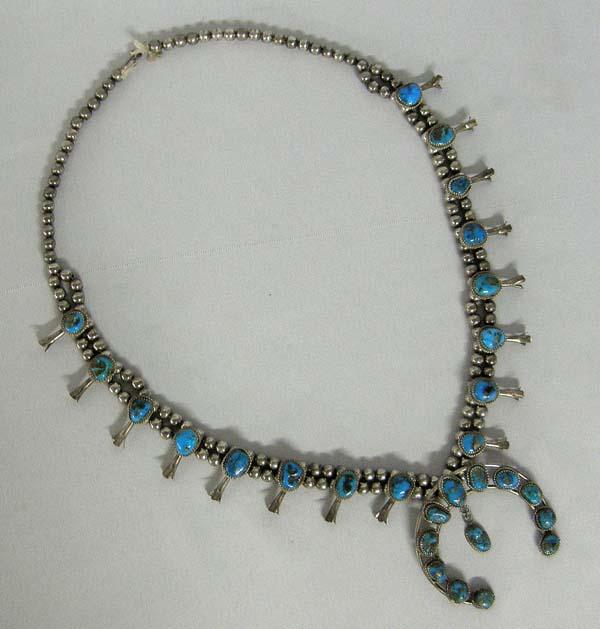 Navajo Silver Turquoise Squash Blossom Necklace. Set with Kingman Turquoise with Iron Pyrite Matrix. Measures approx. 26'', pendant measures approx. 2 1/2'' x 2 1/2''. SHI $20.