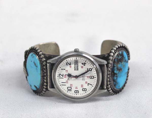 Native American Navajo Silver Turquoise Watch Bracelet, missing silver leaf on one side and watch doesn't work, each stone surrounded by silver beads, inside measurement of 6.75'' x 1.5''W, largest stone measures approx. 1 1/8'' x 7/8'' and contains brown and black matrix.
