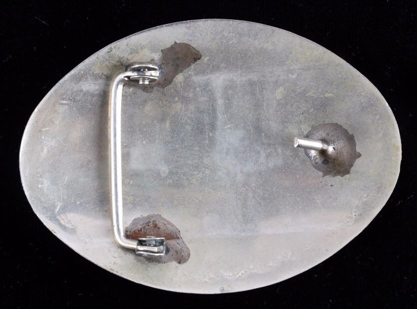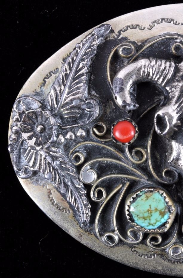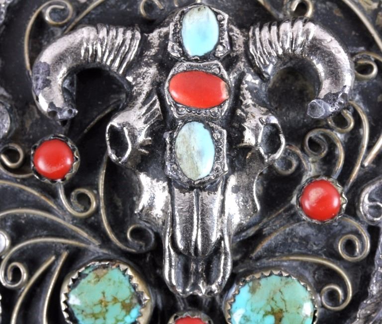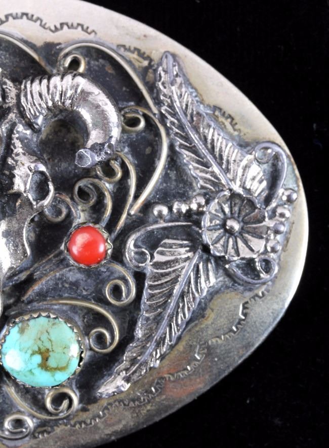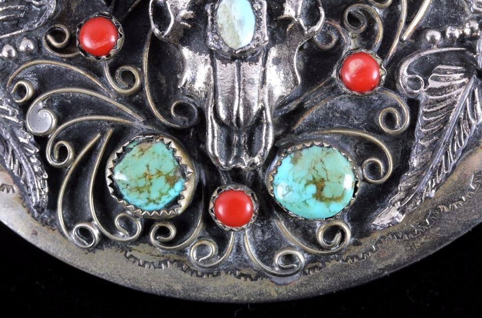 This is a Navajo silver and turquoise belt buckle. The buckle is believed to be sterling silver, but has not been tested. The buckle features a beautifully crafted steer skull in the center surrounded by feathers and scrollwork. The buckle also has impressive turquoise and coral accents. The Navajo belt buckle is in good condition. It measures 2.5" x 3.5".
