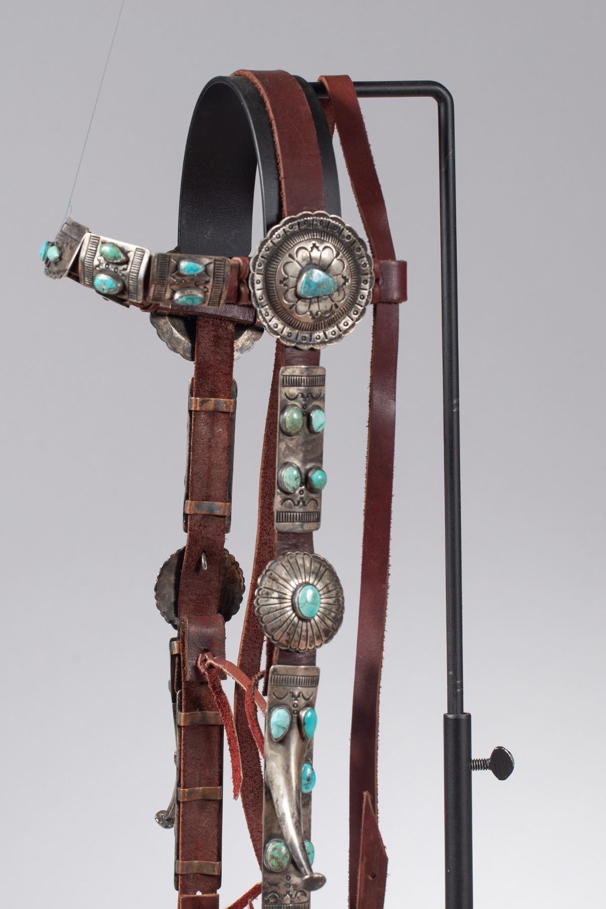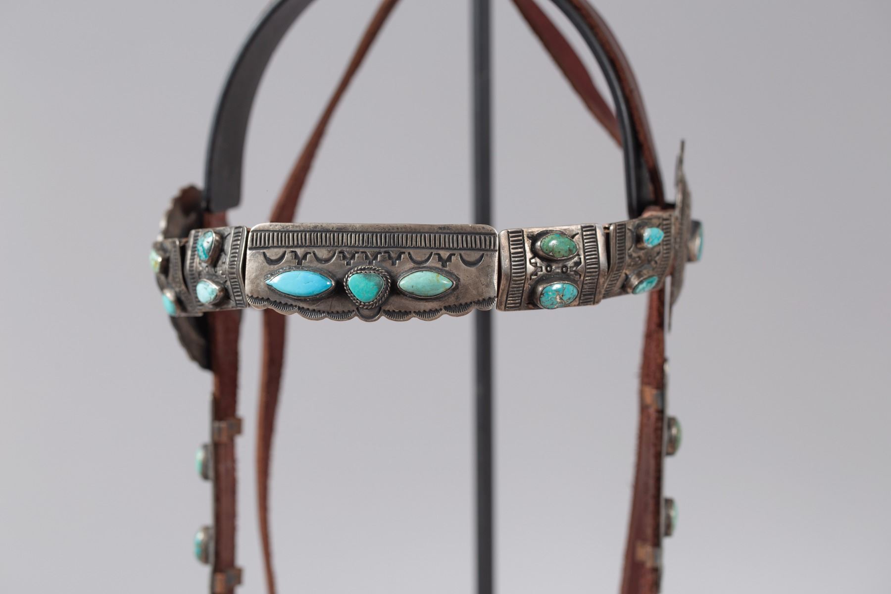 A stunning, handmade Navajo sterling silver and leather bridle. Adorned with a total of 34 cut pieces of turquoise set throughout the headstall, with 8 stones prominently featured on the browband. The silverwork is intricately detailed with fine stamping. The bridle is completed by a California-style bit.