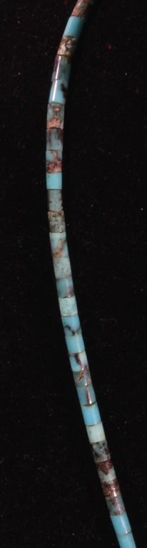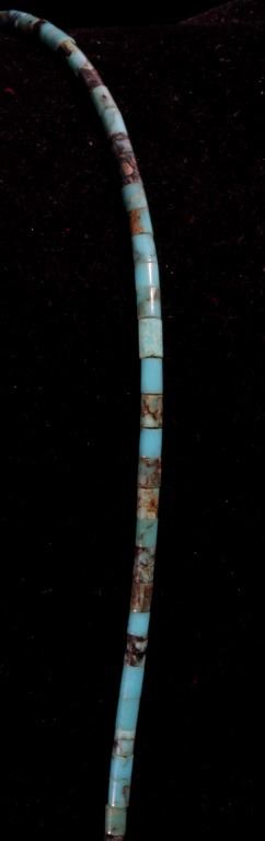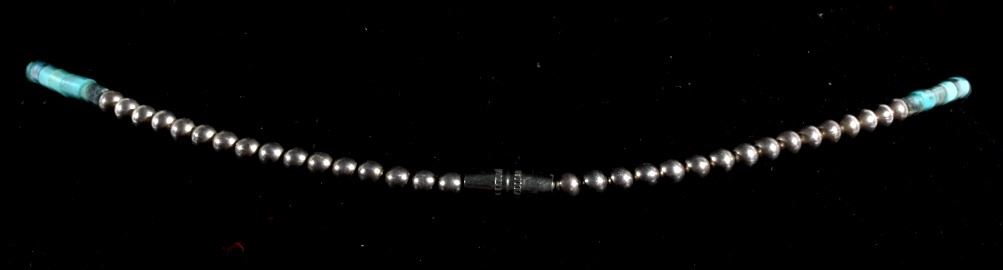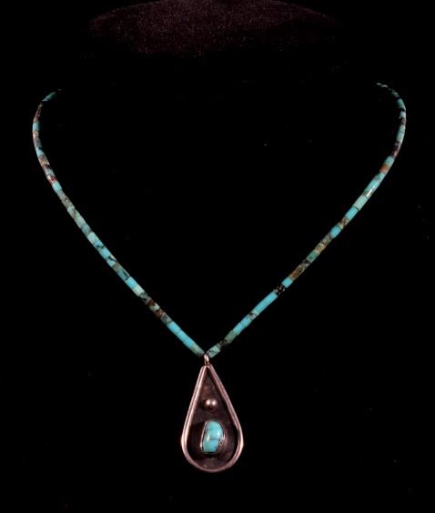 For your consideration is a Navajo silver and turquoise necklace. The necklace is crafted with cylindrical turquoise beads. Silver is unmarked and untested. The pendant is adorned with a stunning turquoise nugget. The necklace measures 9" long when clasped and 16" long unclasped.