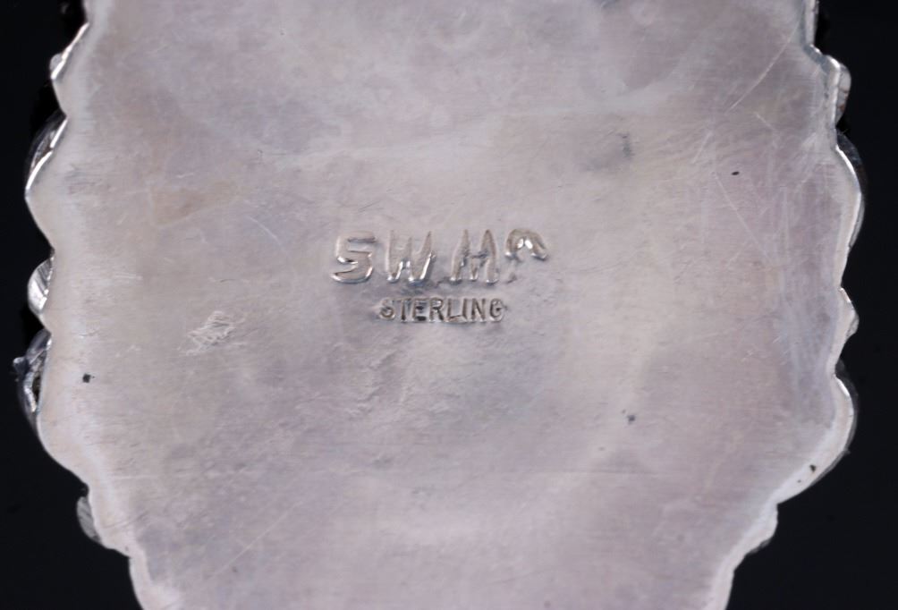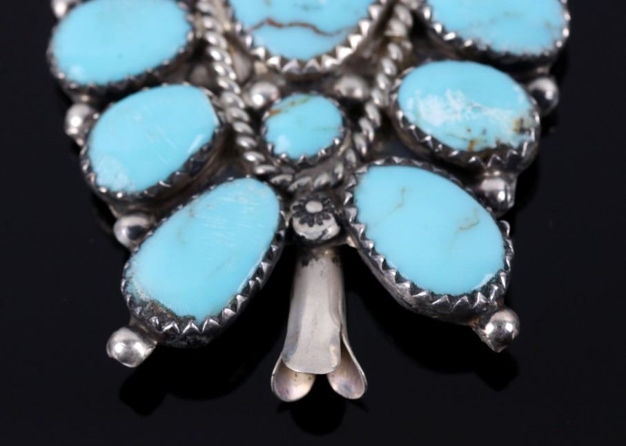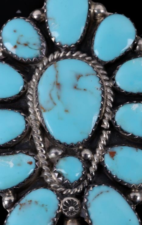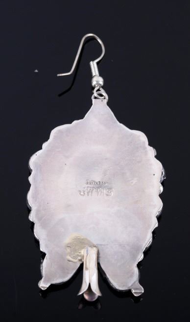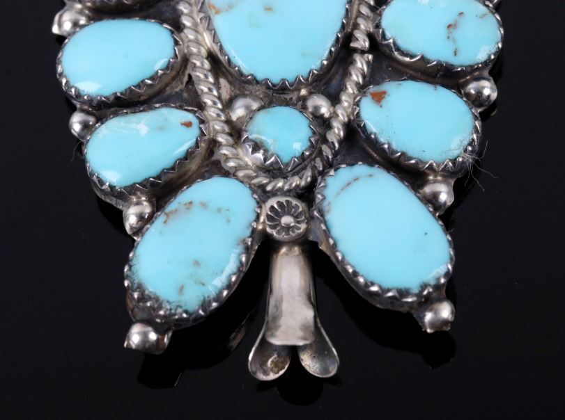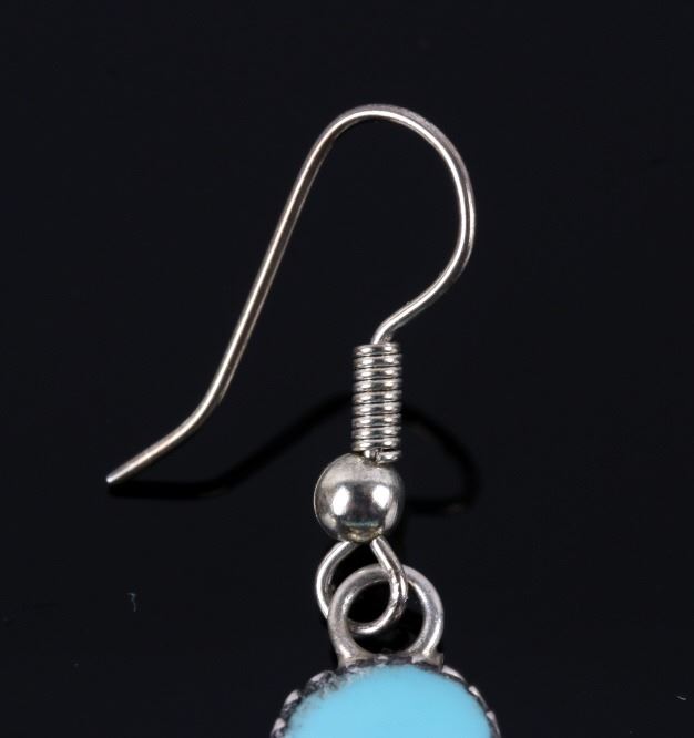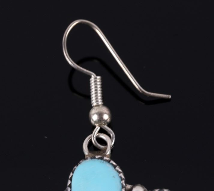 For your bidding pleasure are signed Navajo Native American Sleeping Beauty turquoise earrings. This set of earrings is a wonderful display of Navajo craftsmanship. These pieces are signed by two artists one being Julianna Williams and the other unknown. The earrings are composed of 13 Sleeping Beauty turquoise gemstones and adorned at the tip with a blossom. The stones are complimented by a sterling silver rope and beads. The earrings measure 2" x 1 3/8".
