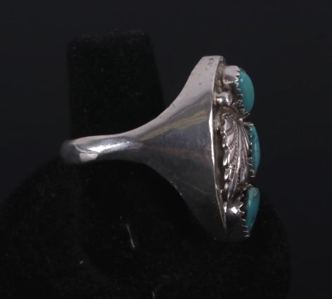 For your consideration is a Navajo Sleeping Beauty turquoise and silver ring. This ring features three Sleeping Beauty turquoise cabochons decorated with silver floral designs. The ring is a US size 12 1/2.