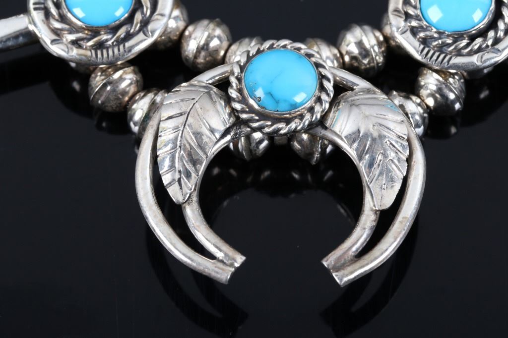 Featured in this lot we have a Navajo Native American sterling silver sleeping beauty turquoise squash blossom necklace. This fine piece shows a large central Naja pendant, flanked on both sides by five blossoms. Each charm of the necklace is adorned with a Sleeping Beauty turquoise gemstone, silver rope, and tooled droplet and leaf designs. The pendant and charms are strung onto a double strand sterling silver beaded concho chain. The necklace shows good condition overall with some minor wear. The necklace measures 23 1/4" long unclasped with the Naja measuring 1 1/4" wide by 1 1/8" long.