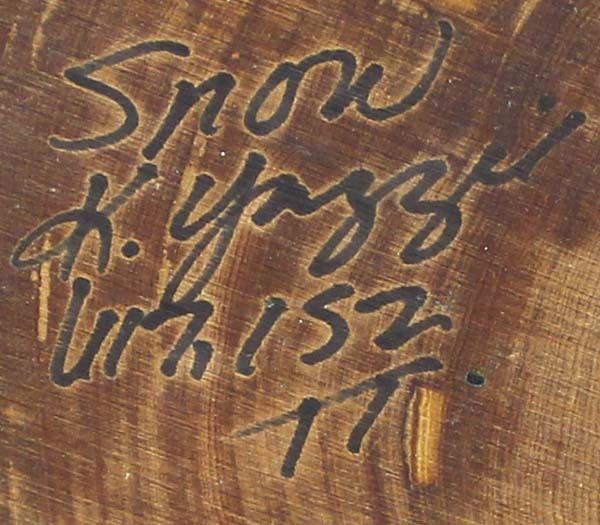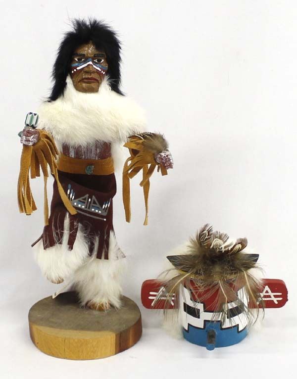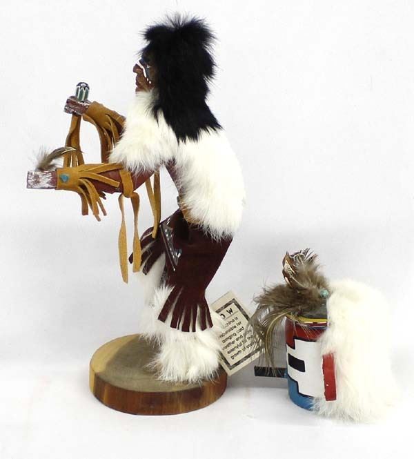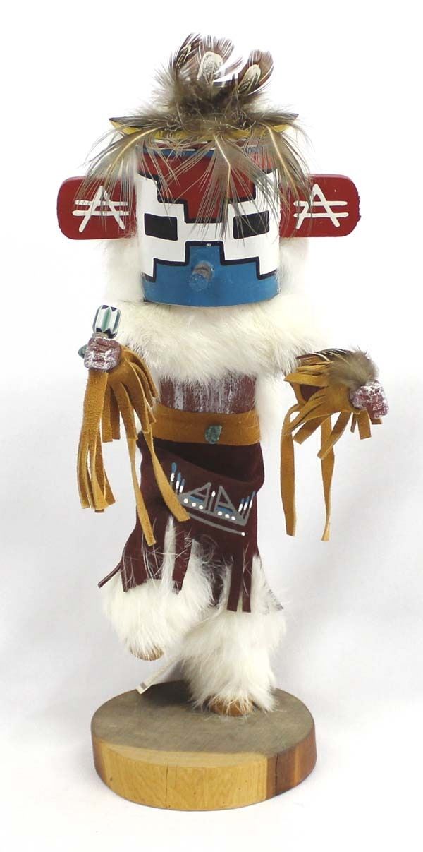 Native American Navajo Snow Kachina by Kimberly Yazzie, measures 5'' x 13'' x 6.5'', embellished with feathers, leather, rabbit fur, turquoise, bead, on a cedar wood base, signed on the bottom, comes with COA, headpiece is removeable revealing human head, well executed