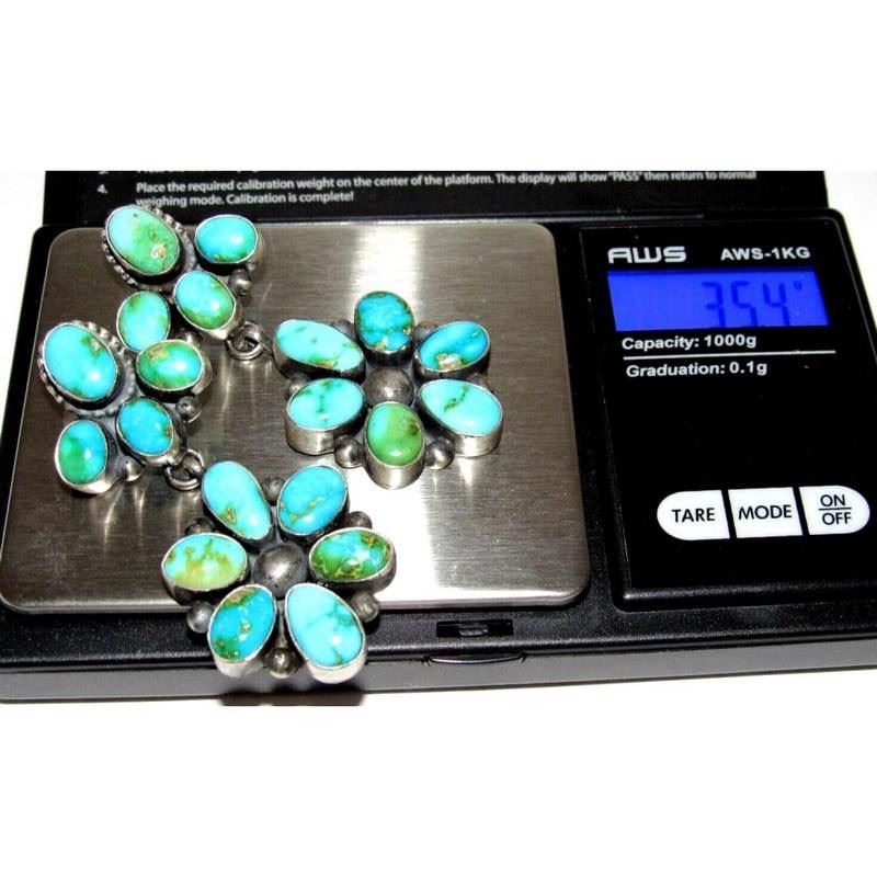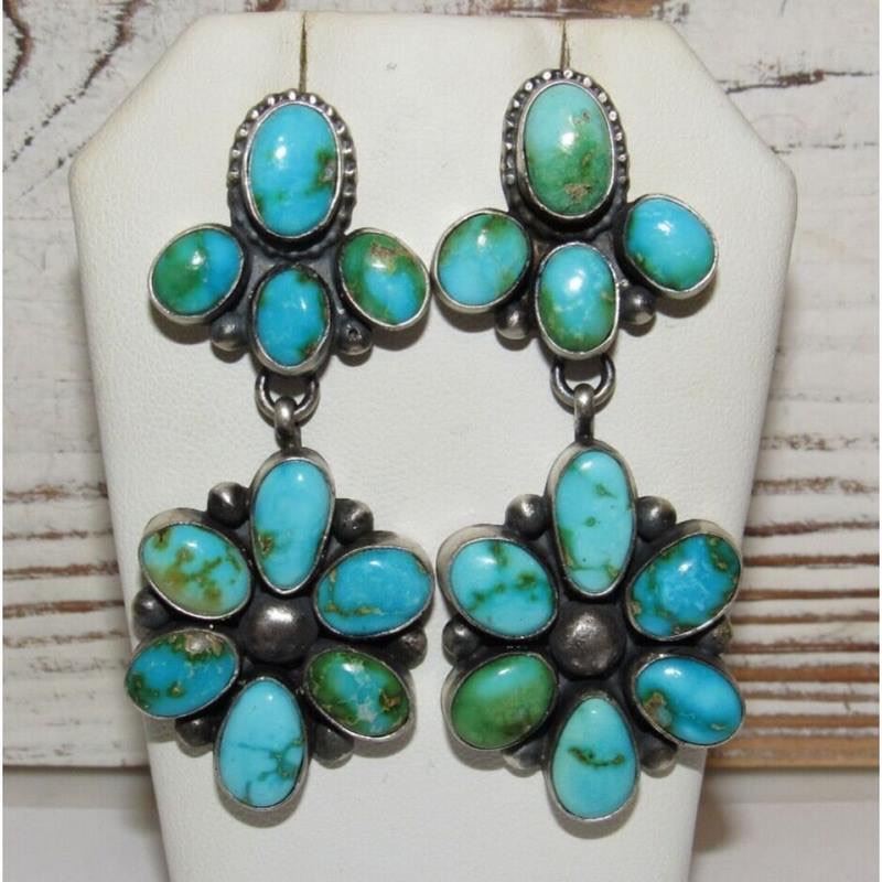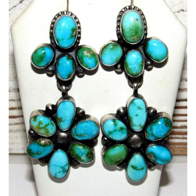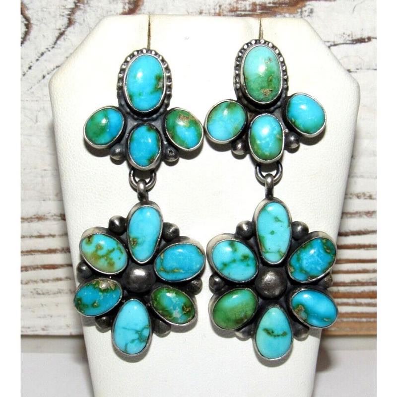 Experience the epitome of Southwestern elegance with these Navajo sterling silver and amazing high quality gem grade Sonoran Gold turquoise in the desirable shades of greens with blues cluster dangle earrings, masterfully crafted by the talented Navajo artist Dave Skeets. Measuring at 2.5 inches long, these earrings beautifully balance size and sophistication. The intricate cluster design showcases the mesmerizing allure of Sonoran Gold Turquoise, exuding a sense of timeless beauty from the heart of the Navajo craftsmanship. Weighing 35.4g in total for both earrings, these earrings provide a comfortable and luxurious wear. Elevate your jewelry collection with a touch of Native American artistry and the enchanting hues of the Southwest's most cherished gemstone. FREE SHIPPING ON ALL JEWELRY ORDERS WITHIN THE US!