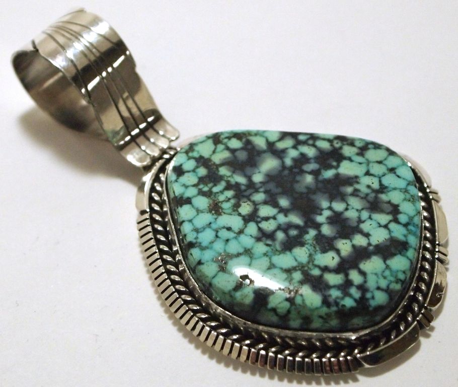 Navajo Spider Web Kingman Turquoise Sterling Silver Pendant - Eugene Belone