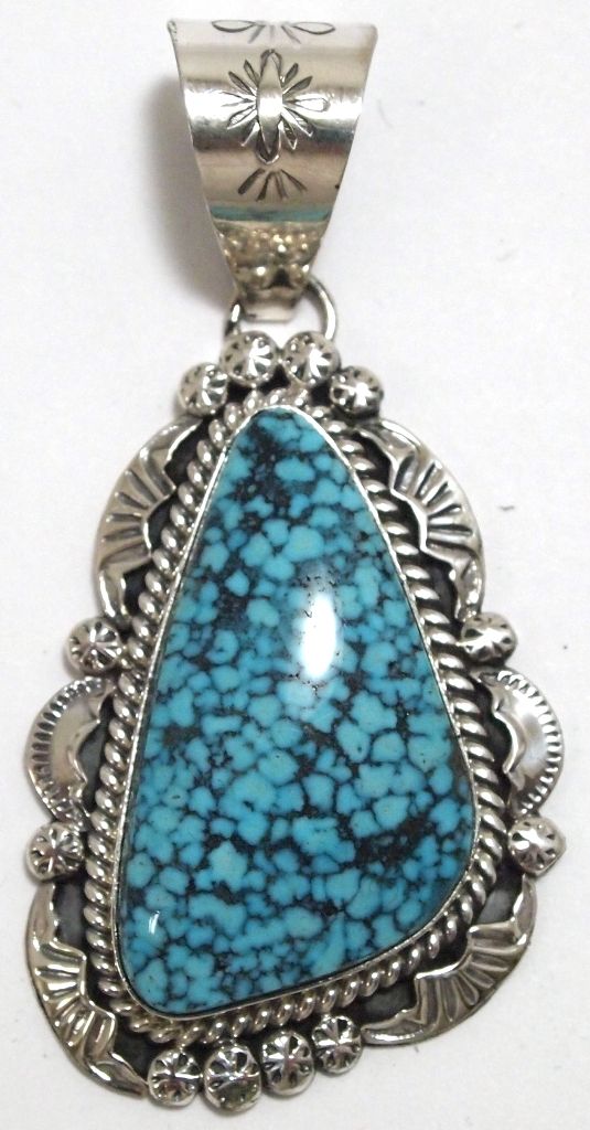 Navajo Spider Web Kingman Turquoise Sterling Silver Pendant - Mary Ann Spencer
