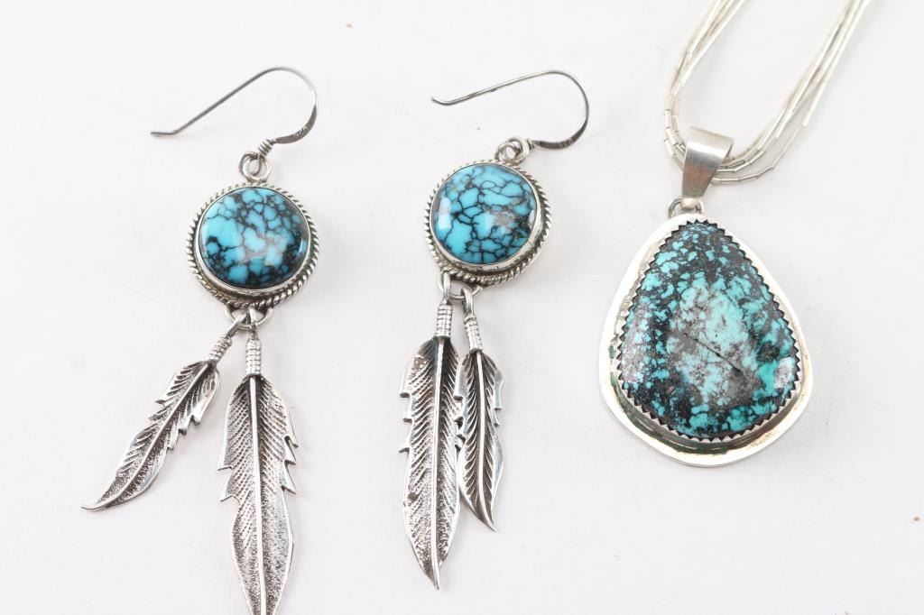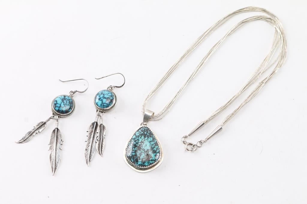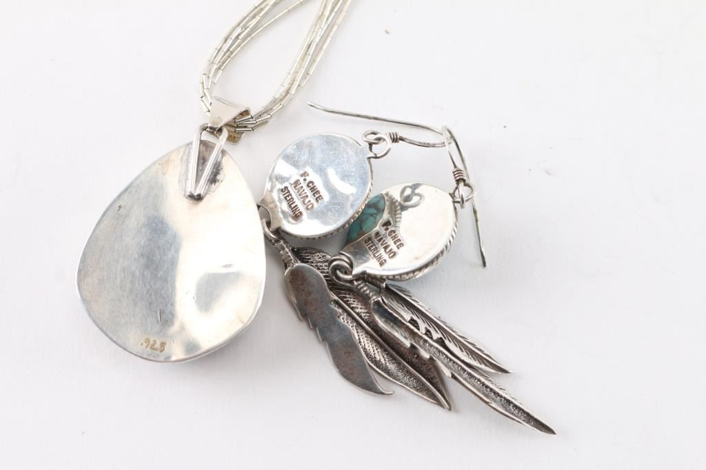 Pendant on sterling shimmering waters chain with matching earrings. The earrings are marked F.Chee.