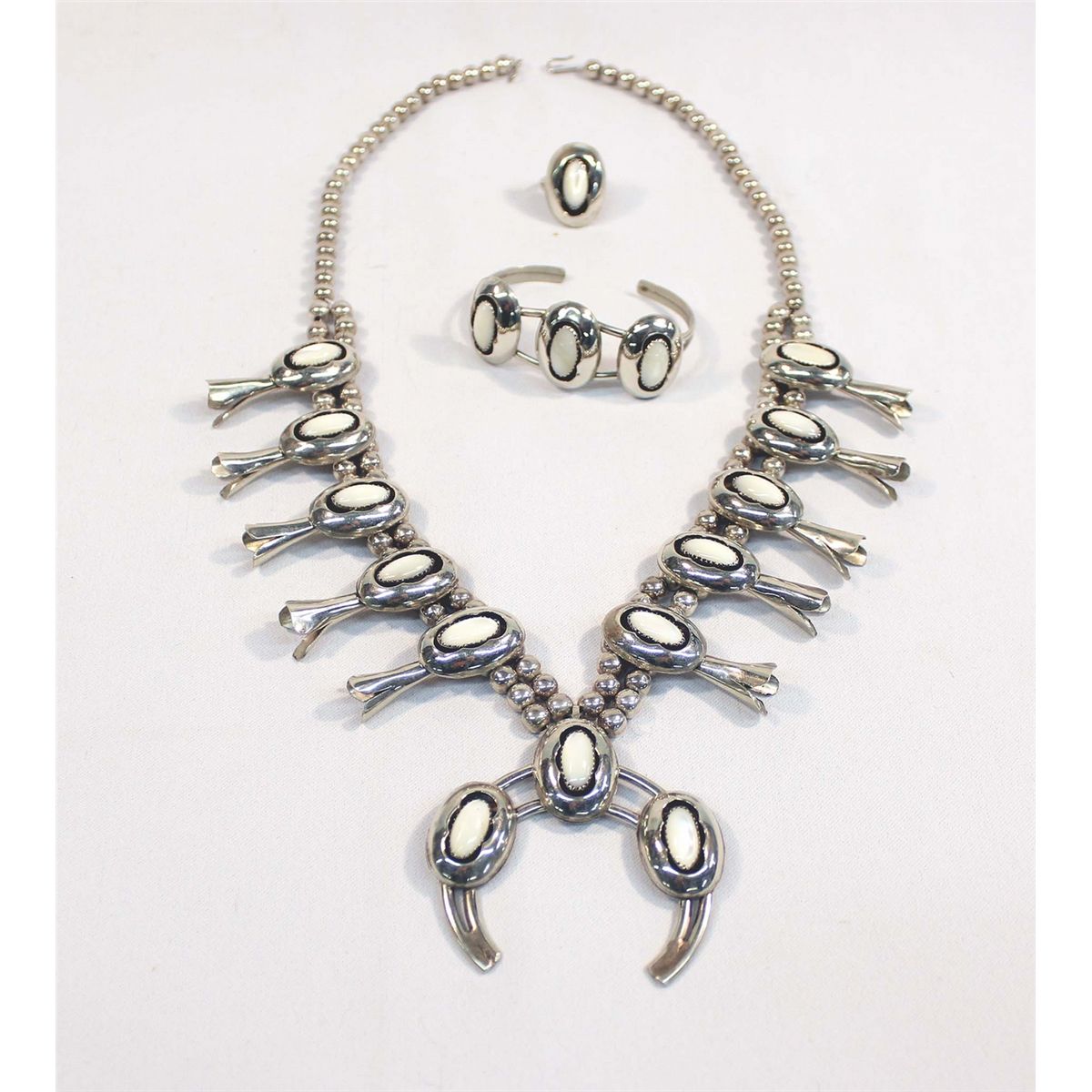 Native American Navajo Squash Blossom Necklace, Ring, Earrings Set. This set is German silver shadow box setting of Mother of Pearl. The bracelet is 6.25'' inside including opening x 1'' wide. The ring is a size 8.5. The necklace is 24'' end to end. The Naja is 2.5''W x 2-3/8''L.